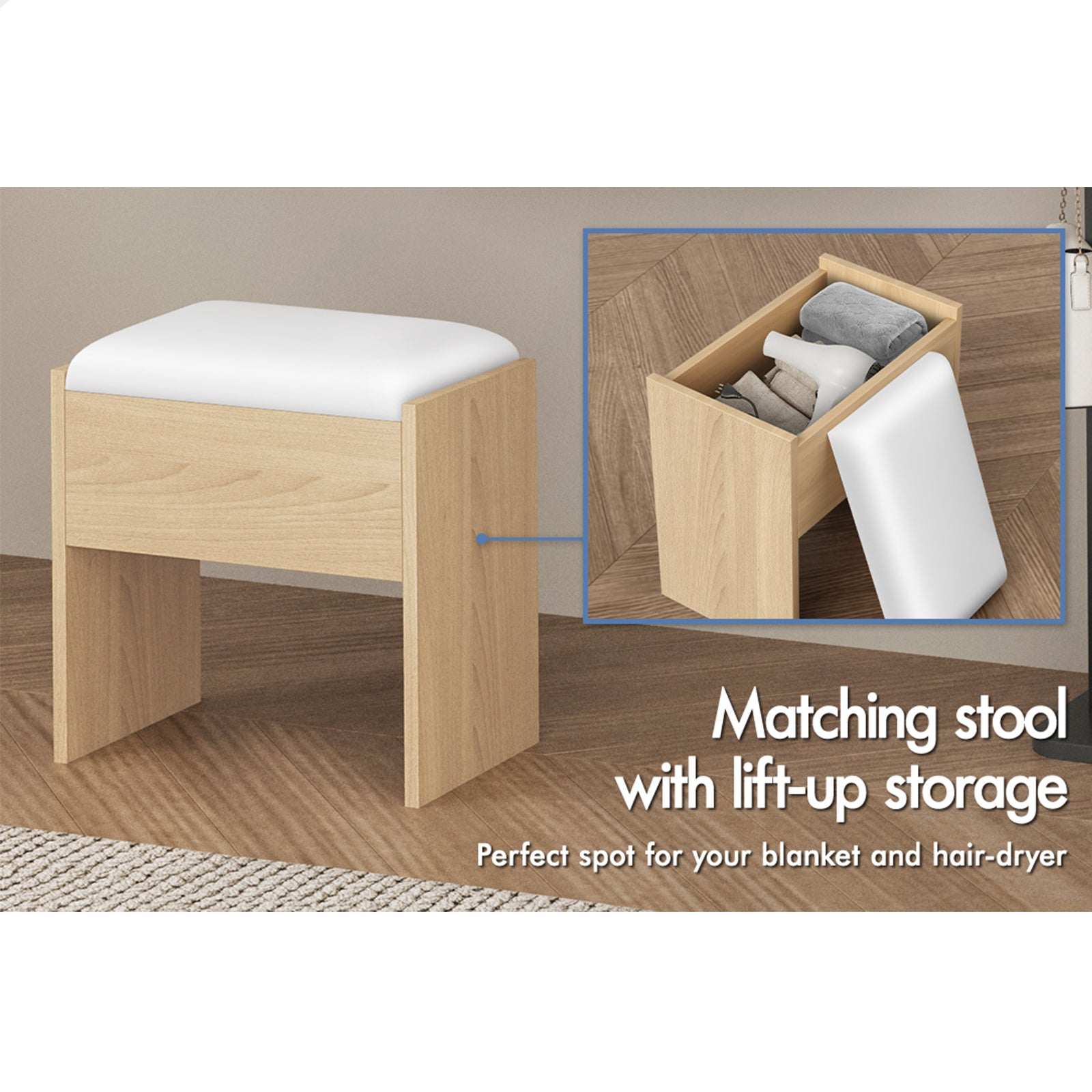 Comes with matching chair - The matching upholstered stool will provide you with a comfortable sitting position while applying make-up. Furthermore, with lift-up lid for easy storage, it is a perfect spot for your blanket or hair-dryer.