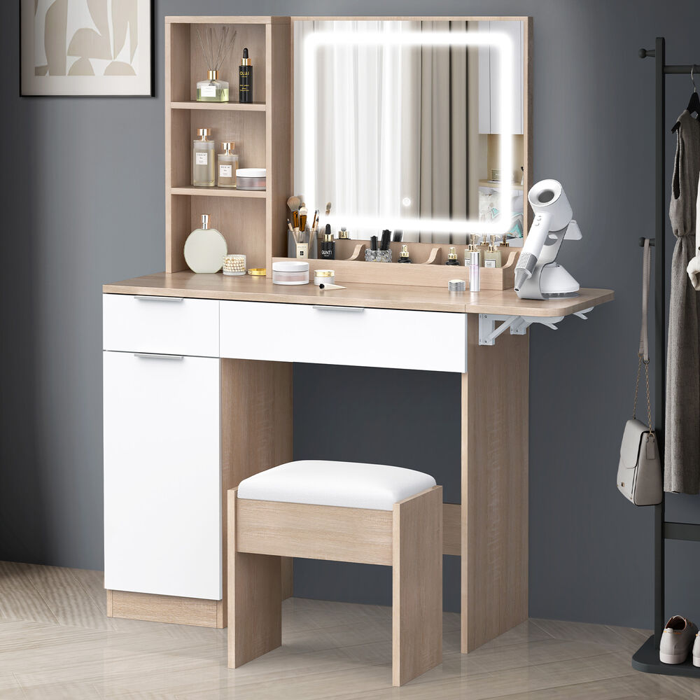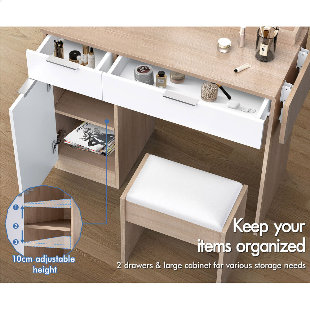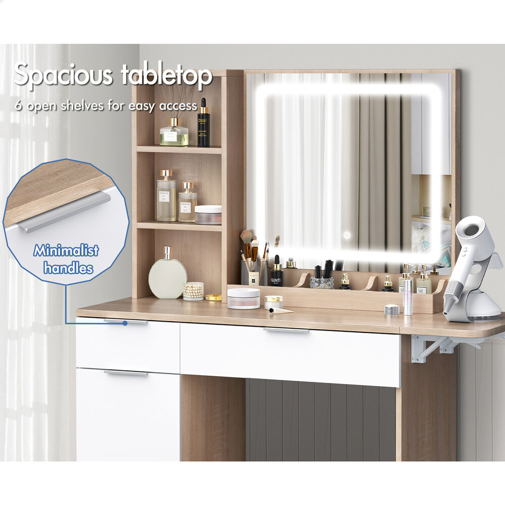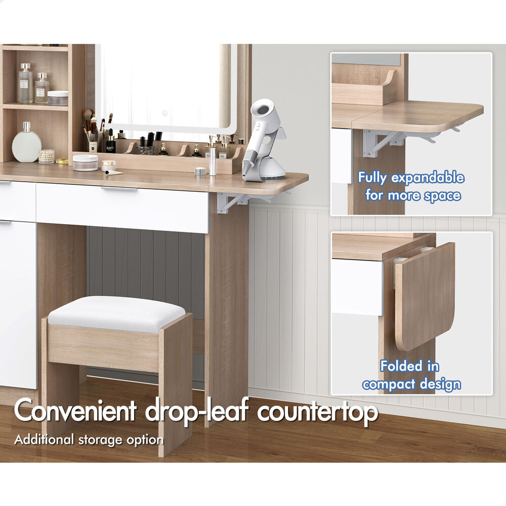 Keep your items organized - This dressing table features 2 drawers, 6 shelves in different sizes and a side cabinet for various storage options. For items you want to access easily, like make-up products, lotions, or perfumes, you can simply put them on desktop of table. For other items, like jewellery, you can store them away in drawers and cabinet so they won't gather dust. With remarkable convenience, there is a drop-leaf countertop which is easily extended for placing your hair-dryer or folded up when not in use, providing flexibility in your beauty routine.