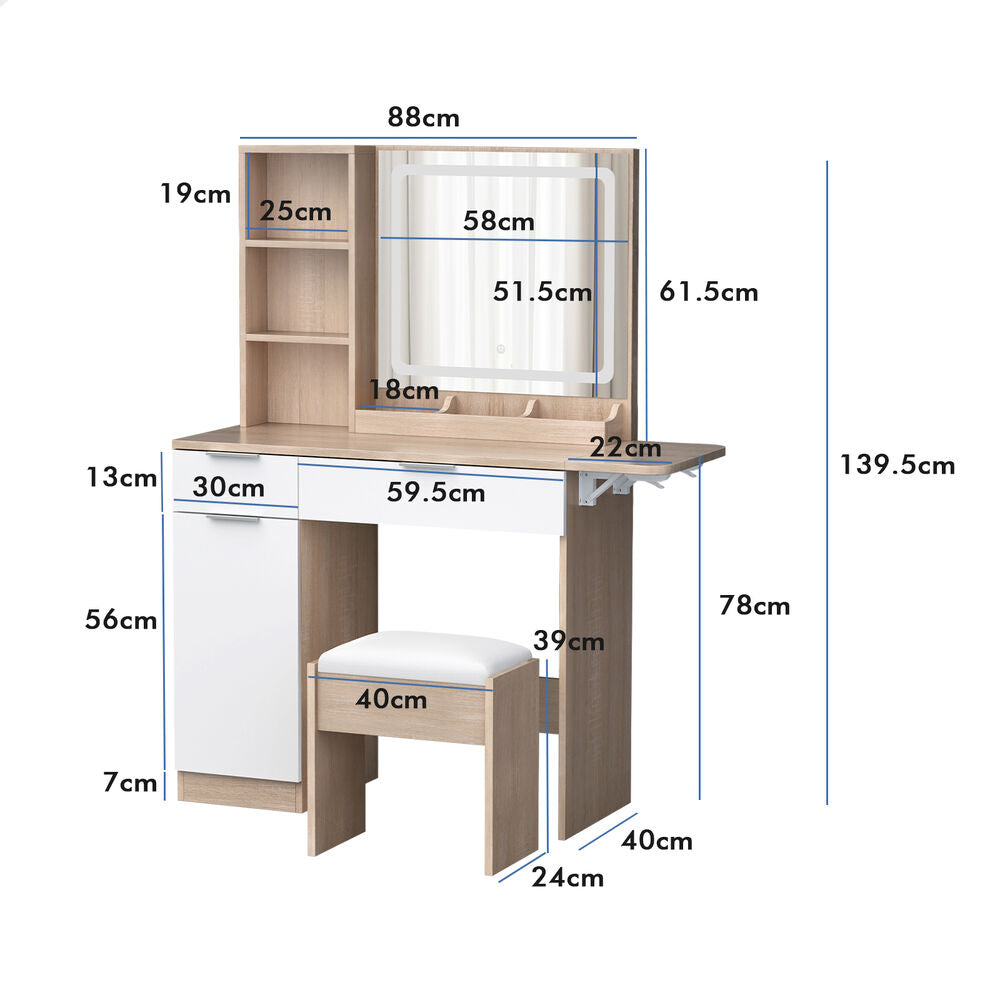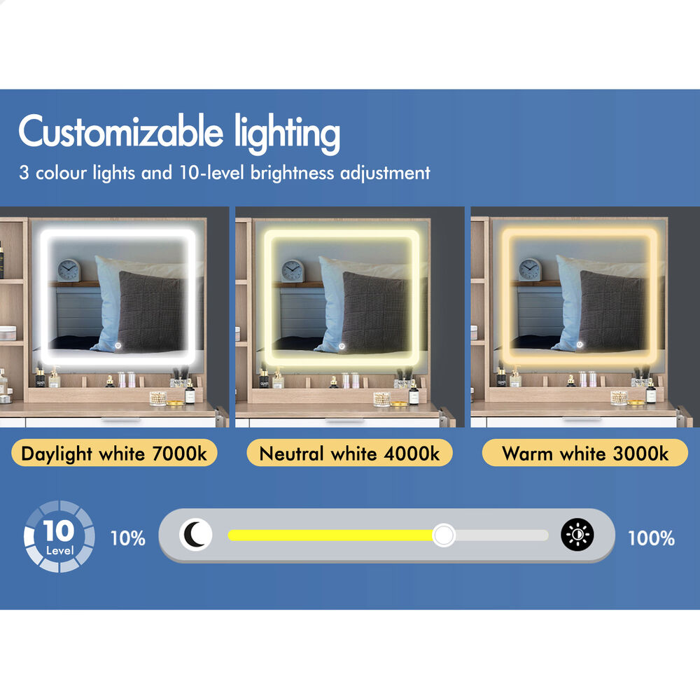 Customizable lighting - Good lighting is important to achieve your perfect glam look. The dressing table features 3 LED light colours - neutral white, warm white, and daylight white and the brightness of each colour can be adjusted in 10 levels, providing adequate light to complete your make-up.