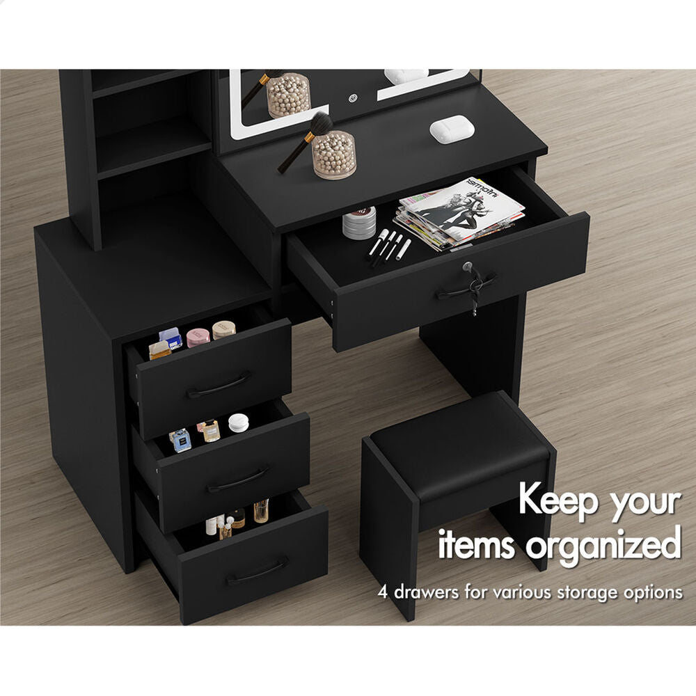Keep your items organized - It features open shelves, 4 drawers and hidden shelving for ample storage space. For items you want to access easily, like make-up products, lotions, or perfumes, you can simply put them on desktop of table. For other items, like jewellery, you can store them away in drawers so they won't gather dust. Featuring a side cabinet, this dressing table can serve as nightstand next to your bed for use.