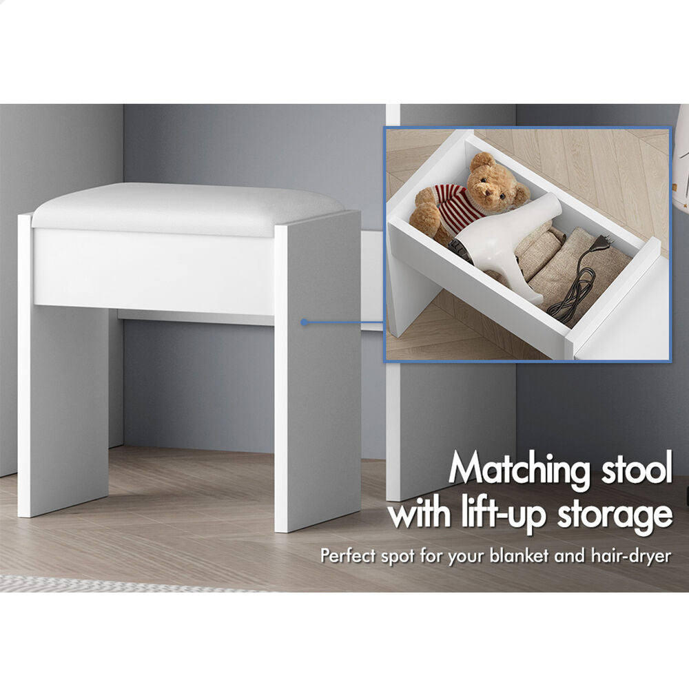 Comes with matching chair - The matching upholstered stool will provide you with a comfortable sitting position while applying make-up. Furthermore, the chair comes with lift-up lid for easy storage, which is a perfect spot for your blanket or hair-dryer.