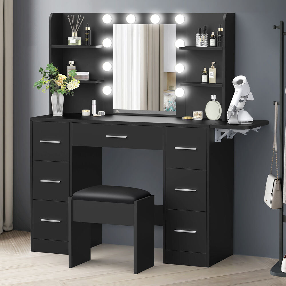 Keep your items organized - This dressing table features 7 drawers in different sizes and 6 open shelves for various storage options. For items you want to access easily, like make-up products, lotions, or perfumes, you can simply put them on desktop of table. For other items, like jewellery, you can store them away in drawers and cabinet so they won't gather dust. With remarkable convenience, there is a drop-leaf countertop which is easily extended for placing your hair-dryer or folded up when not in use, providing flexibility in your beauty routine.