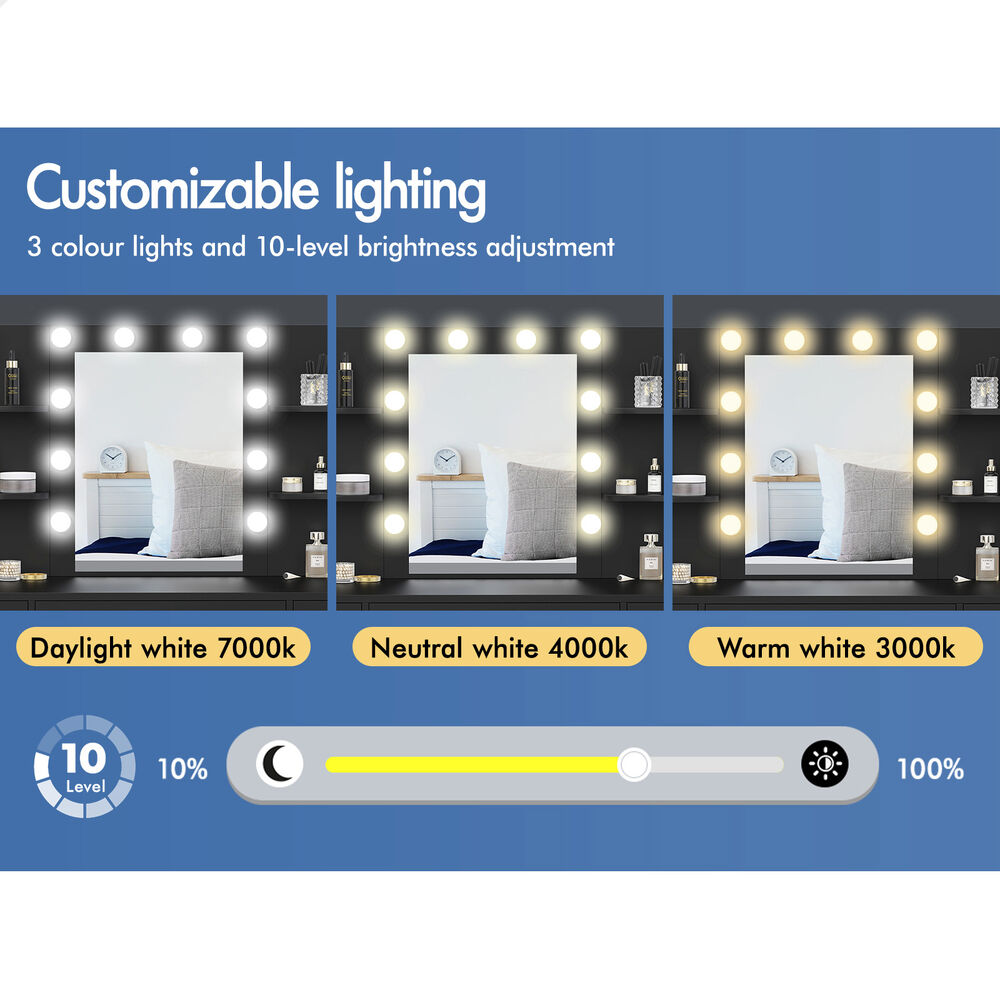 Customizable lighting - Good lighting is important to achieve your perfect glam look. The dressing table features 3 LED light colours - neutral white, warm white, and daylight white and the brightness of each colour can be adjusted in 10 levels, providing adequate light to complete your make-up.