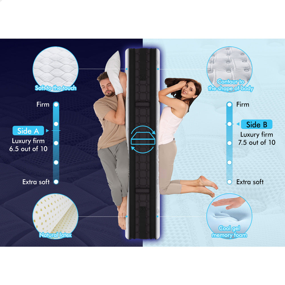 With the OEKO-Tex certified Turkish organic cotton knitted fabric on both top and bottom of the double-sided mattress, it moves with you to maximize comfort. For great pressure relieving capacity, the 100% natural latex layer and cool gel memory foam will offer you great support as well as helping your skin temperature reach and maintain the optimal range for sleep. These responsive layers will contour your body for comfortable alignment and a deeper sleep. Thanks to the flippable two-sided design, it provides a choice of different firmnes for you to sleep on one side of mattress and gives sufficient time for the other side to recover, extending the levels of comfort, support and lifespan.