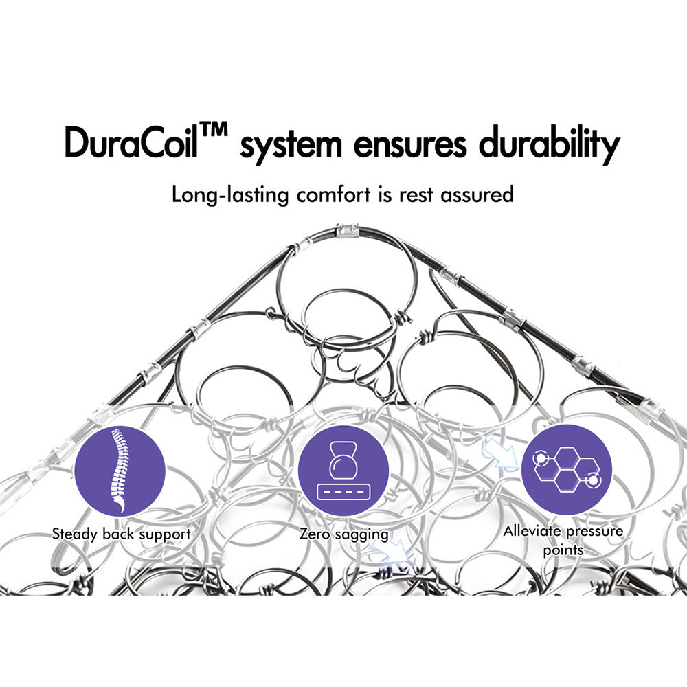 Aside from being comfortable, our DuraCoilTM bonnell spring system inside the mattress is steady and supportive. Being an interconnected mesh of spring coils, the bonnell spring system gives consistent support throughout the bed surface. This spring system particularly helps elevate & align the spine and surrounding muscles together, providing a steady support to the back. In the meantime, The innerspring coils wound together support each other and prevent sagging. The surface stays flat despite any amount of pressure and this helps prevent sagging and deterioration of the internal springs and layers of foam.