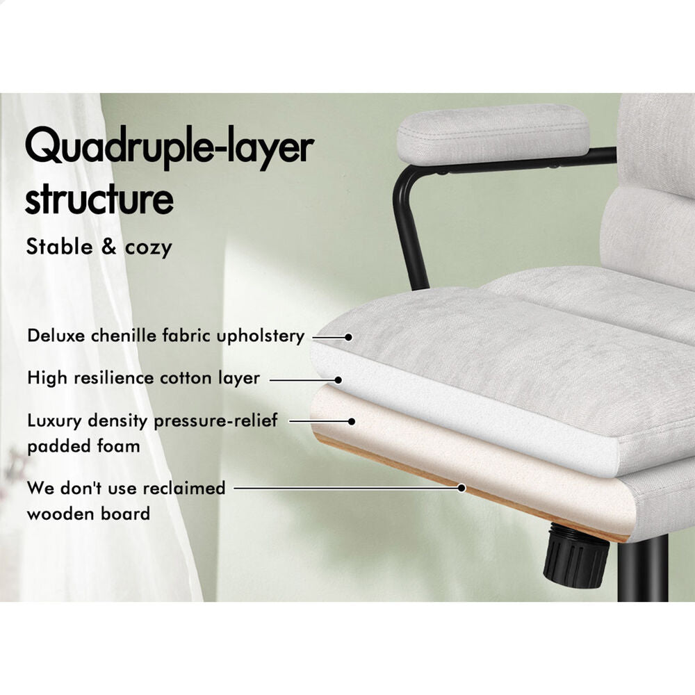 The modern concise design of this office swivel chair will soften any interior or decor you may currently have in your home or office. Upholstered in premium chenille fabric, the dual-layer seat and backrest are richly padded with high-resilience foam. The padded seat provides adequate support in the right places and infinite comfort whenever you want to rest and sit in the chair. Its ergonomic flared armrests design cradle your arms in a natural position, relieving unnecessary shoulder and arm strain and staying at your peak for long periods of time in optimal comfort.