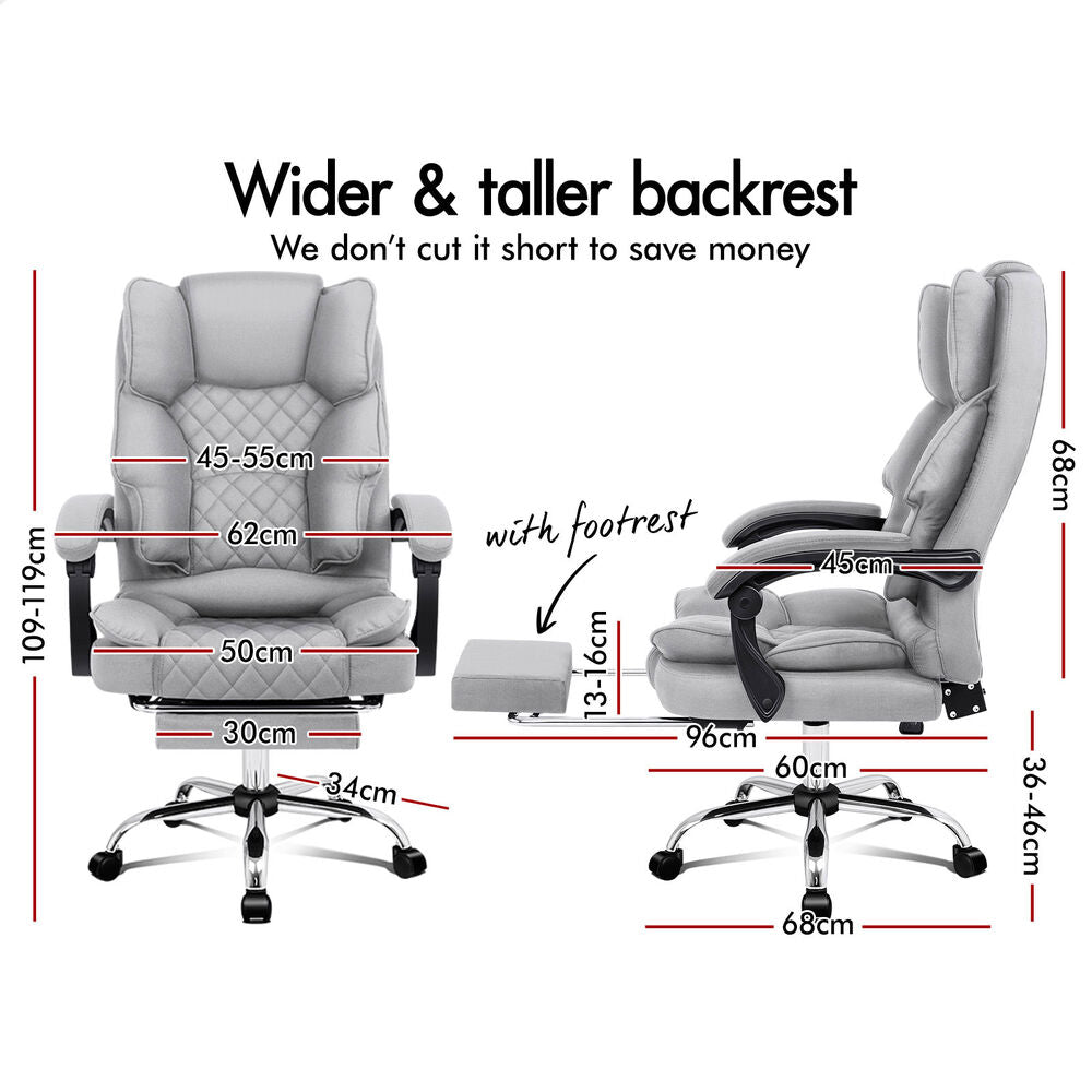 A stylish chrome base with TUV certified casters, Intertek approved linen fabric, SGS approved Gas-Lift system and tilt function, delivering absolute five star luxury. And unlike some other sellers, we have no compromise on materials used. We guarantee that no cycled foams are used, no backrest is cut short or narrow to save money, and no seat foam is cut thin to save cost.