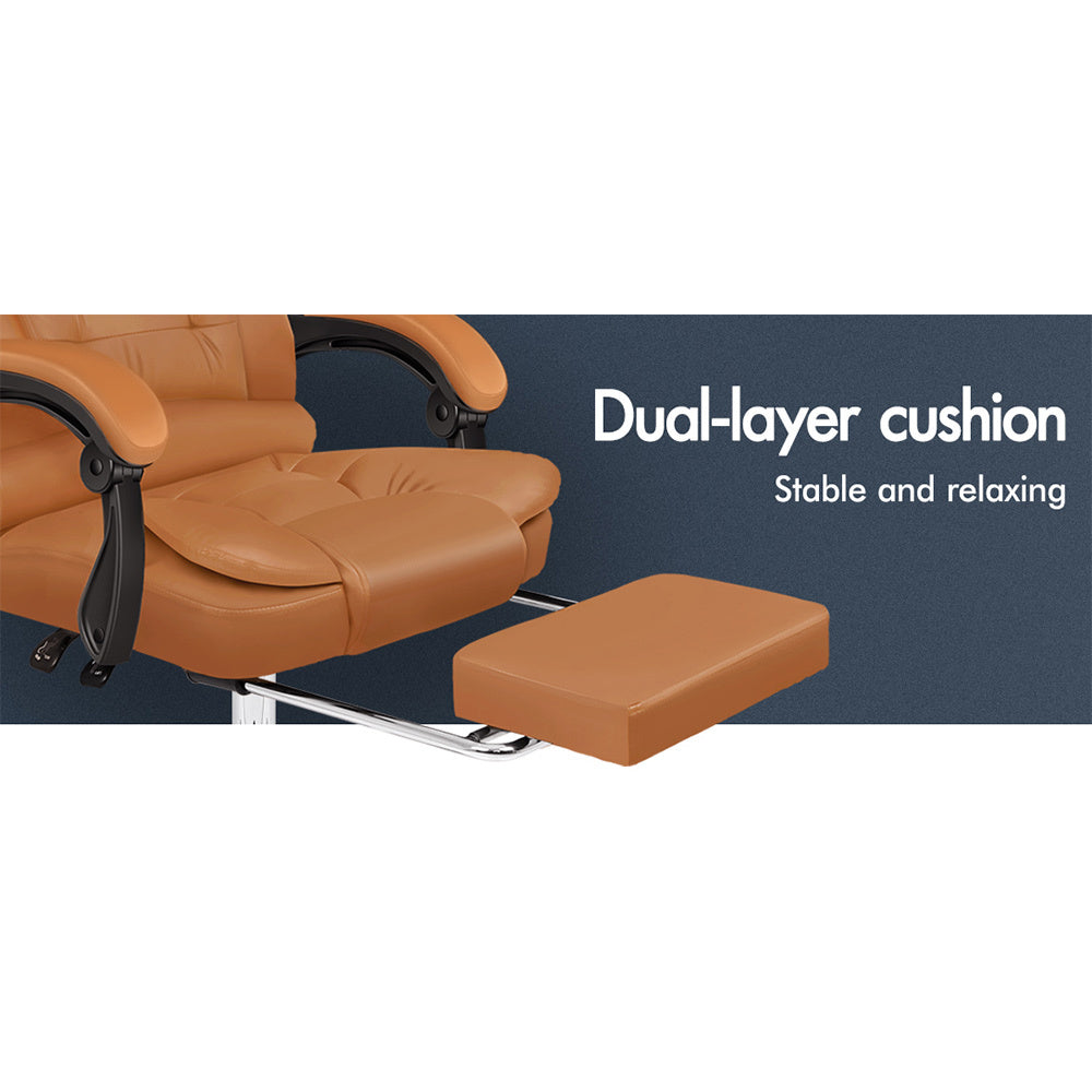 The Alfordson supreme executive office chair is a popular model. It features a dual-layer butterfly design with generous foam paddings, to make sure you can indulge yourself each time sitting on it. Combined with retractable padded footrest and comfortable padded armrests, it gives the style and comfort you need. Its ergonomic S-curve design with built-in lumbar and back support fully contour your body shape, allowing you to work or play in optimal comfort. It features a sturdy chrome base with scuff protectors and 360 degree swivel. The double-stitched upholstery crafted from premium PU leather ensures optimal durability and easy cleaning.