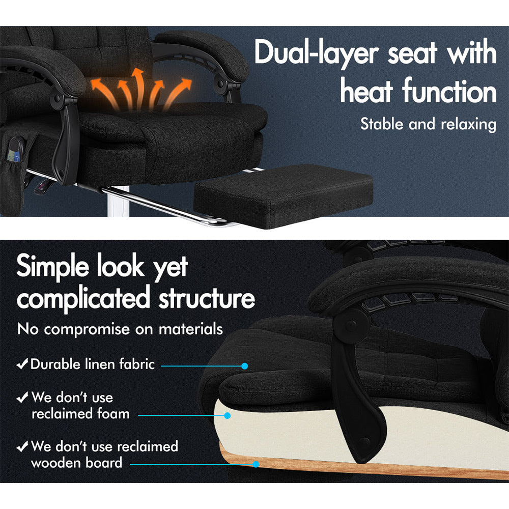 Crafted with innovation in mind, we upgraded the chair with 8 massage points and gentle seat heat function, allows you to work at your peak for long periods of time in optimal comfort. Built with durable linen fabric, generous foam paddings and ergonomically-friendly design, our chair provides your entire body with ample support in all the right places. The chair perfectly combines both comfort and style.