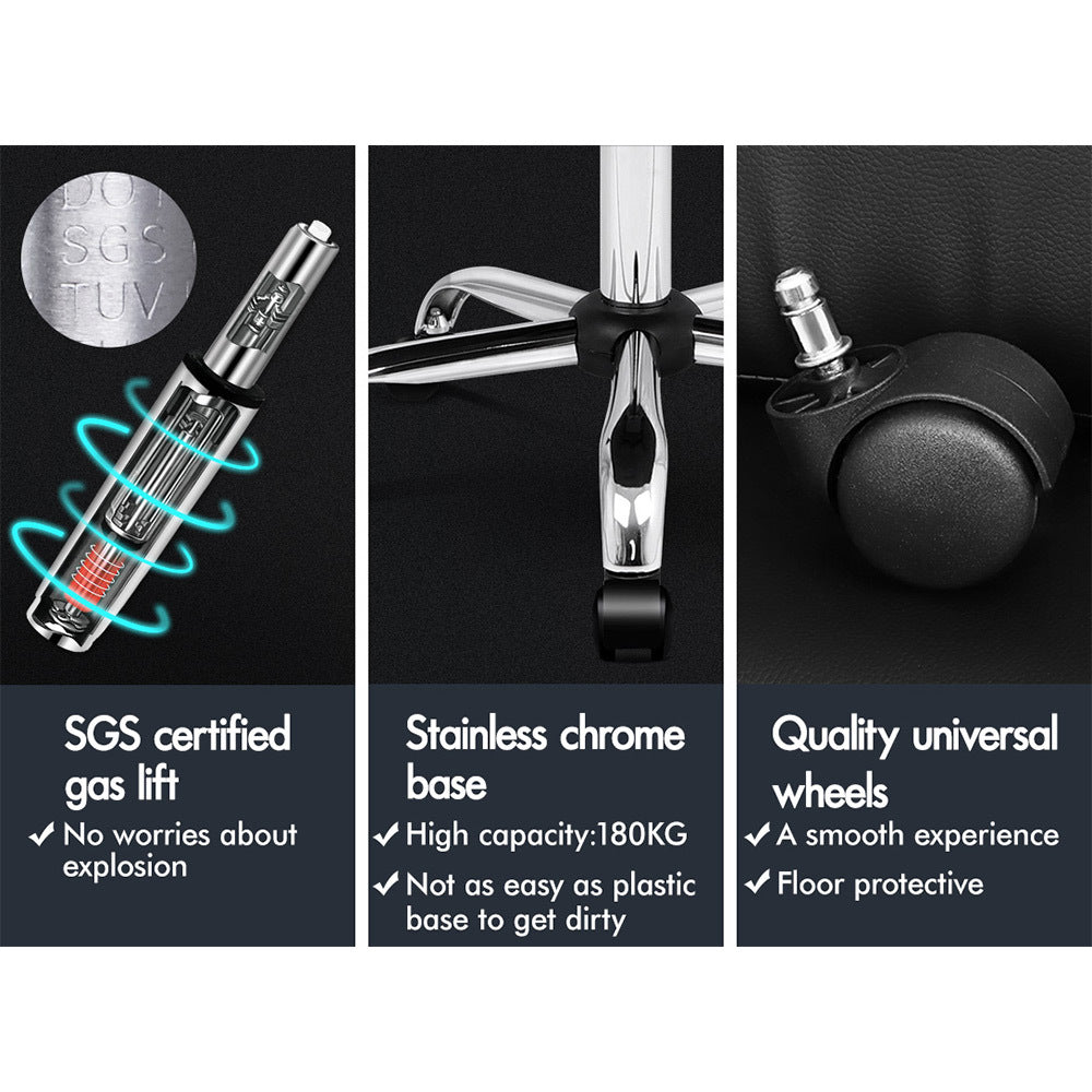 A stylish chrome base with TUV certified casters, Intertek approved linen fabric, SGS approved Gas-Lift system and tilt function, delivering absolute five star luxury. And unlike some other sellers, we have no compromise on materials used. We guarantee that no cycled foams are used, no backrest is cut short or narrow to save money, and no seat foam is cut thin to save cost.