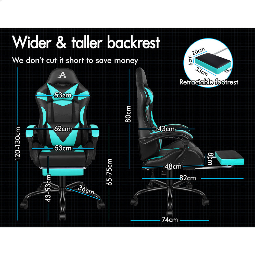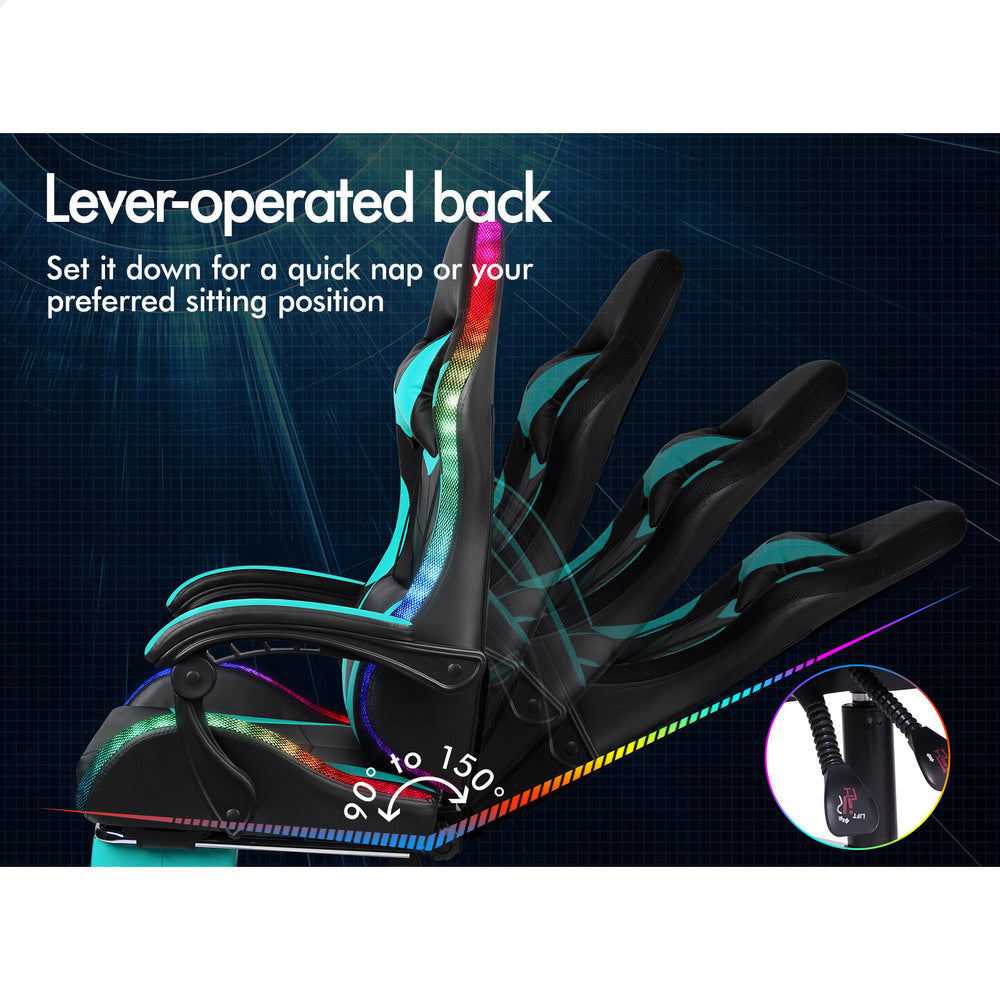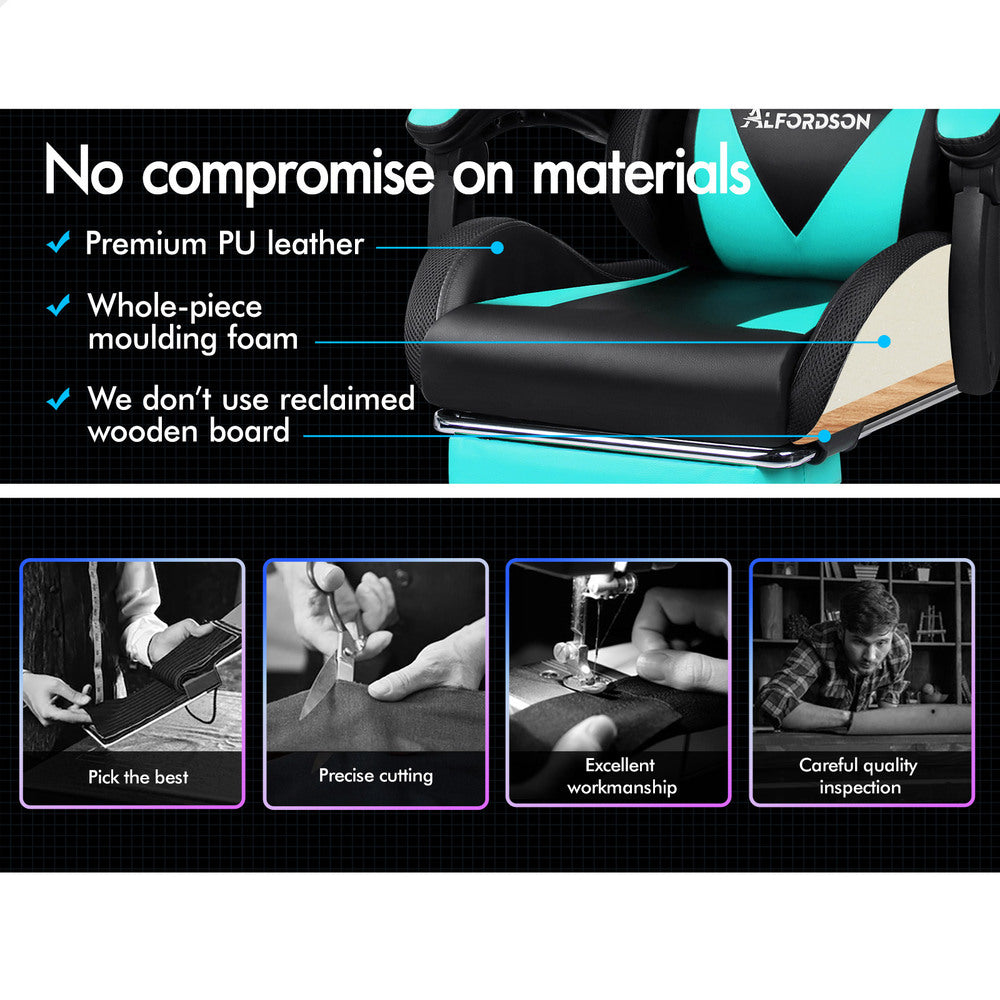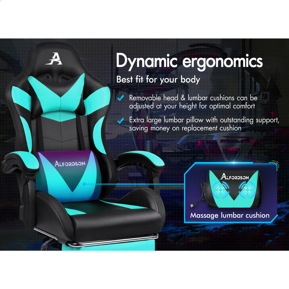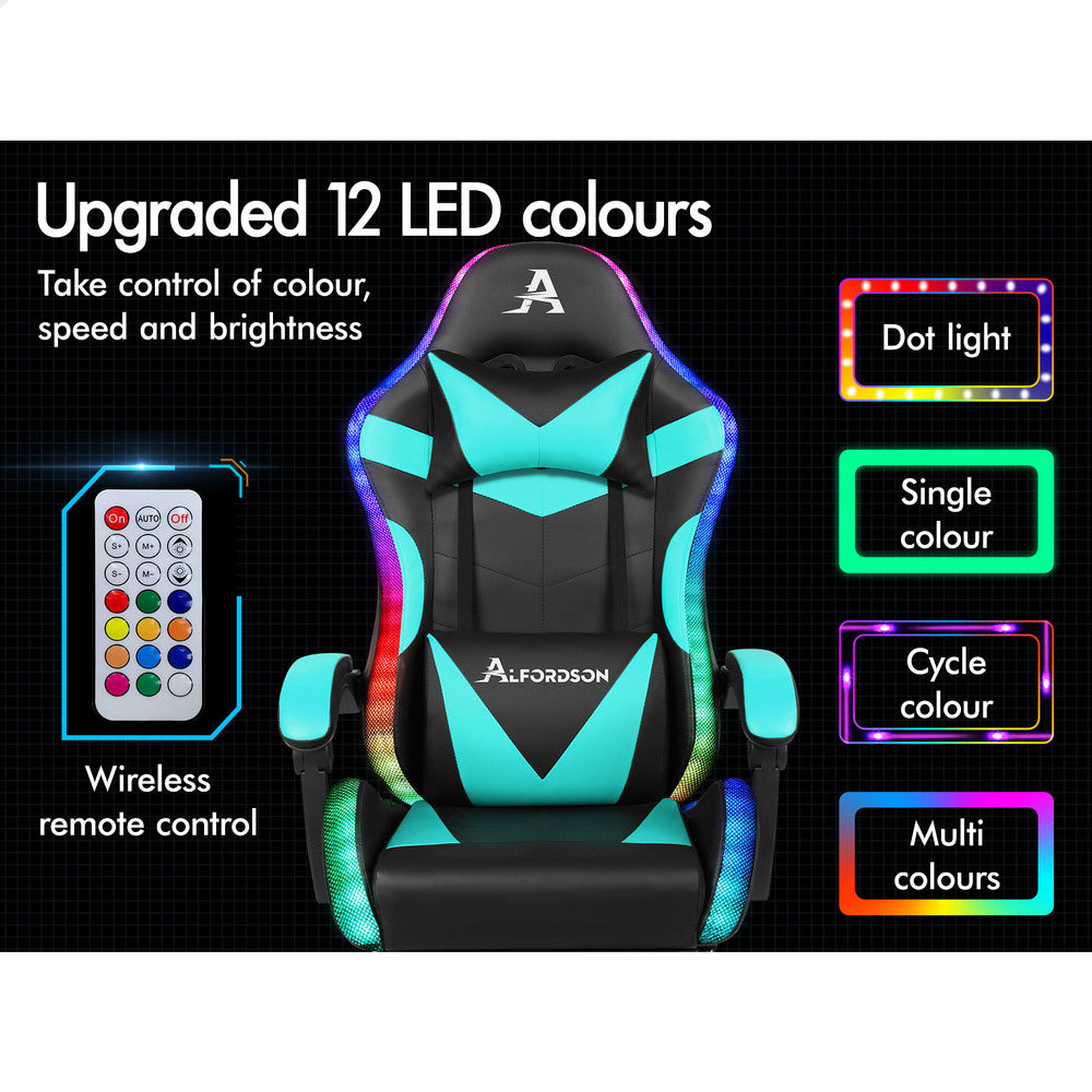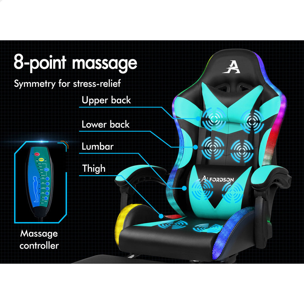 ALFORDSON Gaming Chair Office Massage 12 RGB LED Computer Seat PU Leather Cyan