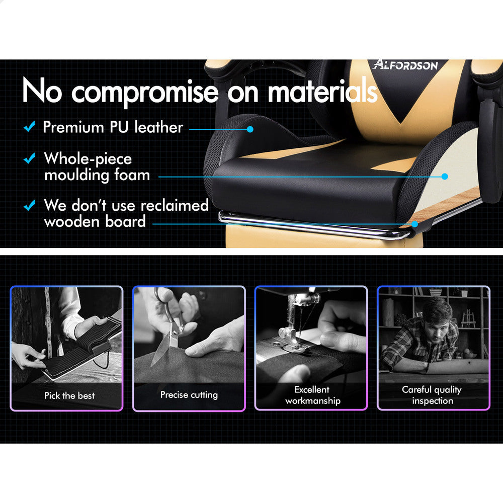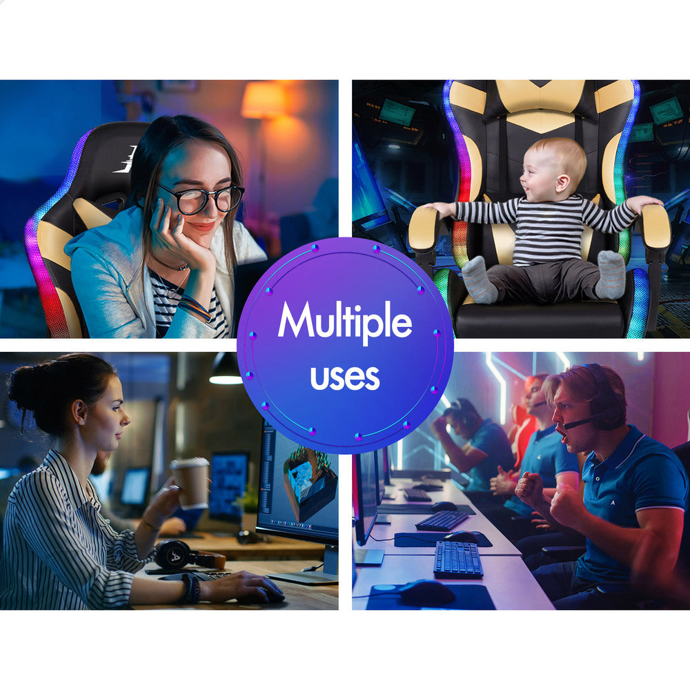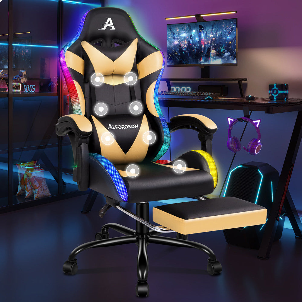 ALFORDSON Gaming Chair Office Massage 12 RGB LED Computer Seat PU Leather Gold