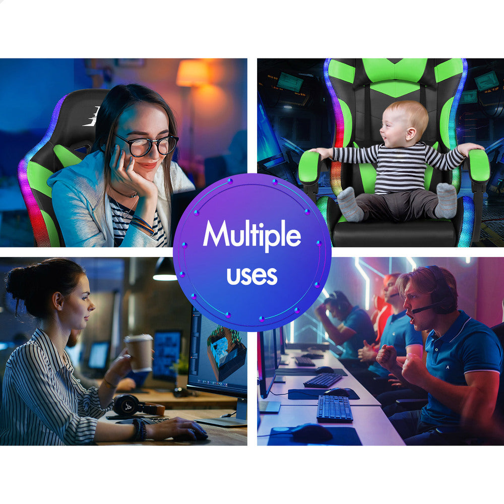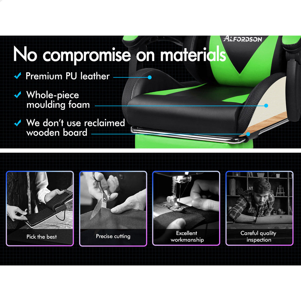 ALFORDSON Gaming Chair Office Massage 12 RGB LED Computer Seat PU Leather Green
