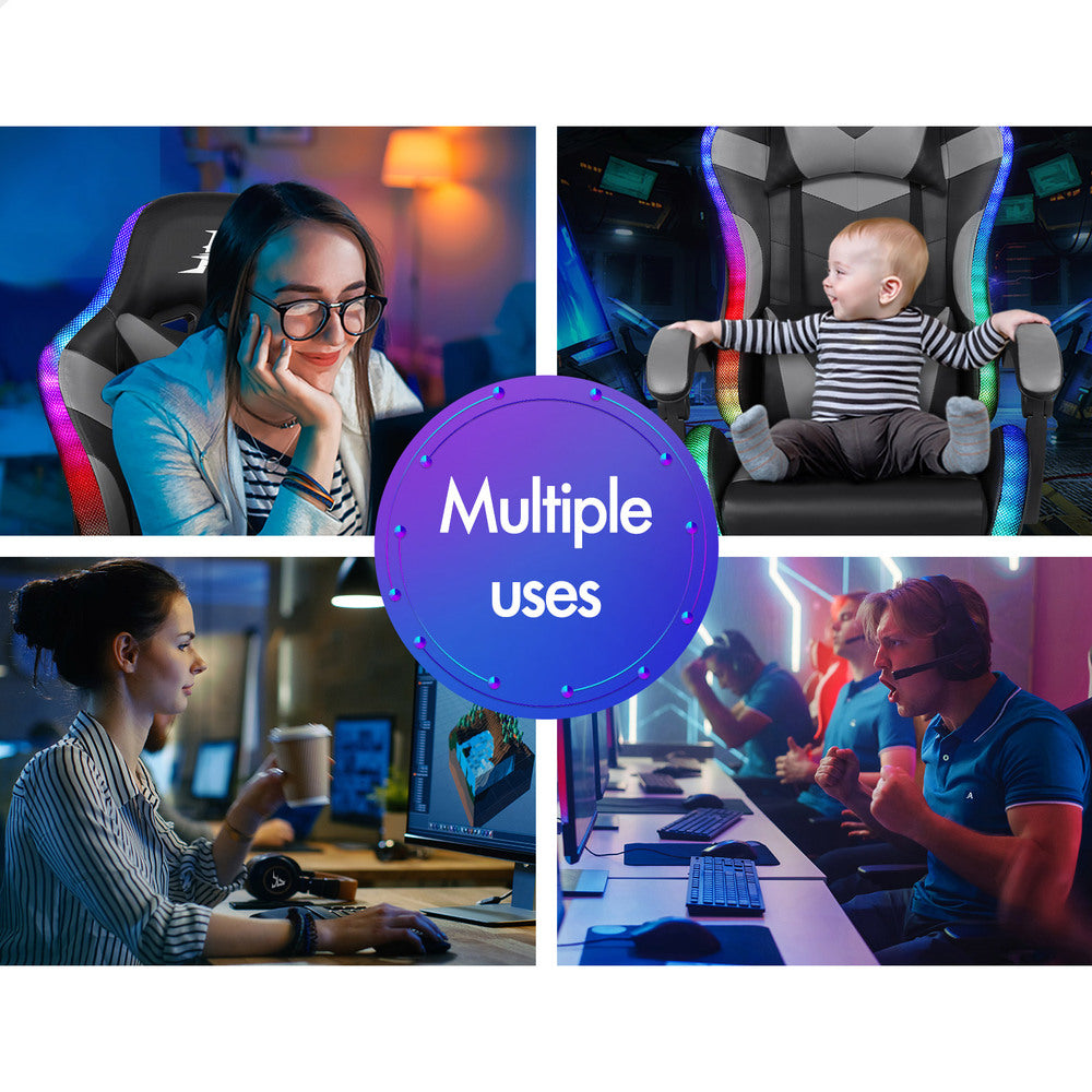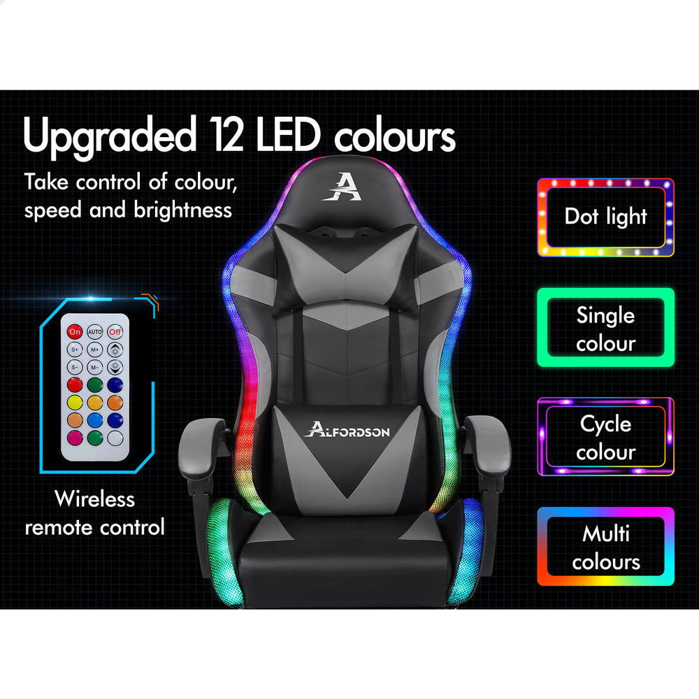 ALFORDSON Gaming Chair Office Massage 12 RGB LED Computer Seat PU Leather Grey