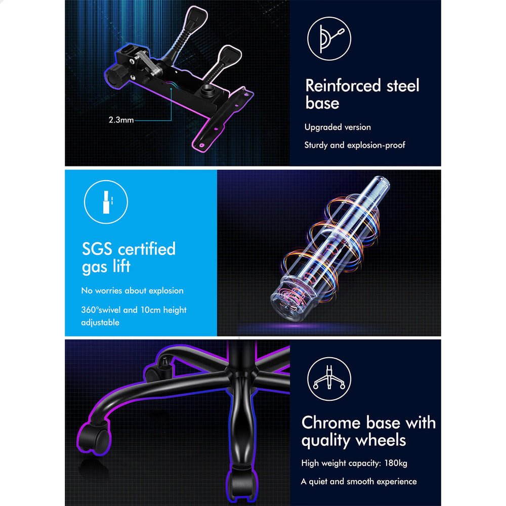Advanced RGB LED lighting design - With 12 colours of LED and multiple light settings, this gaming chair comes with hundreds of lighting modes, providing a unique and aesthetic glow to your gaming setup. Upholstery crafted from premium PU leather and generous foam paddings ensures optimal durability and easy cleaning.