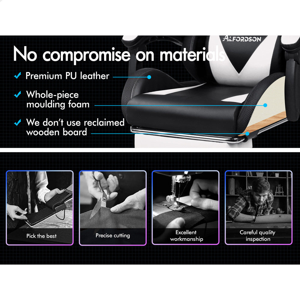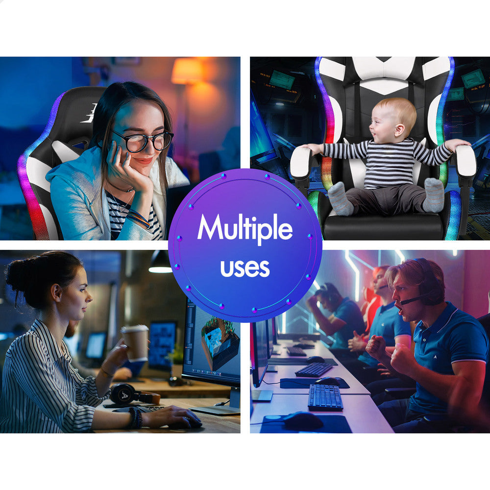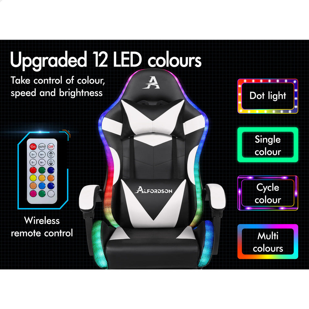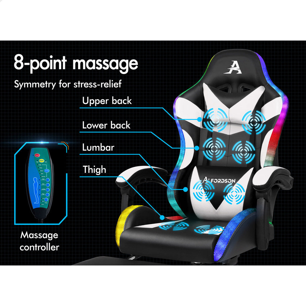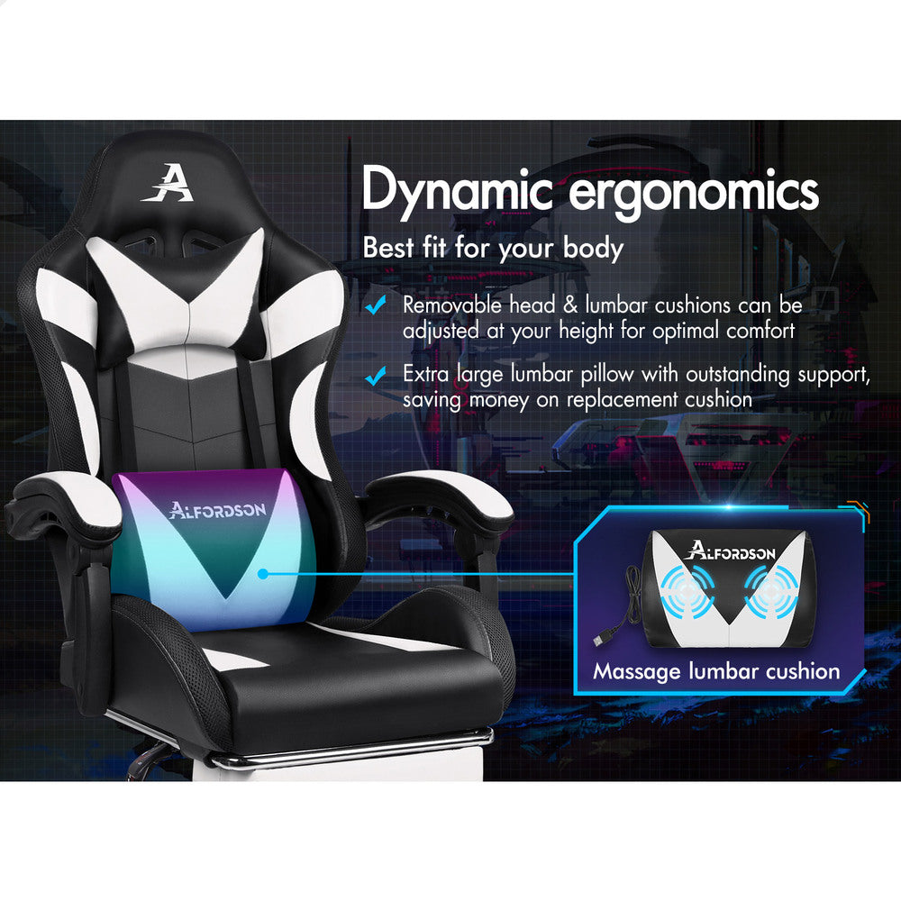 ALFORDSON Gaming Chair Office Massage 12 RGB LED Computer Seat PU Leather White