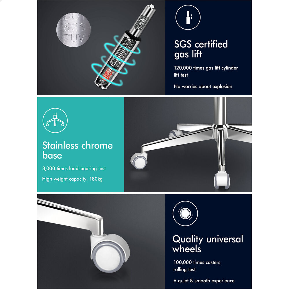 Glide smooth on a reinforced base - Constructed with a sturdy chrome base, TUV certified casters and SGS approved Gas-lift system, the chair is endurable. You don’t have to worry about tipping over or exploding. The 360 degree swivel and height adjustable seat adds more convenience.