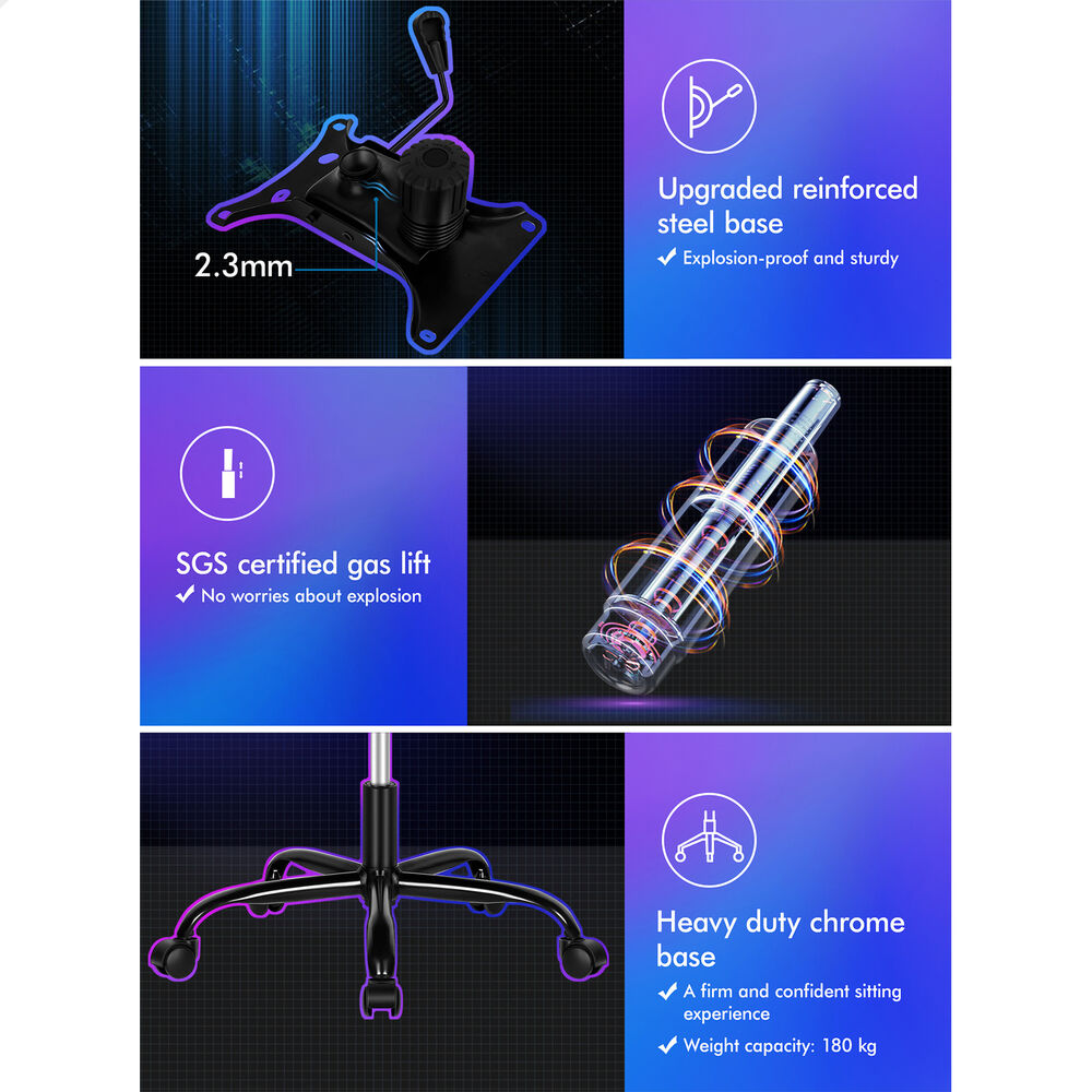 A stylish chrome base with TUV certified casters, Intertek approved PU leather, SGS approved Gas-Lift system and tilt function, the gaming office chair is sure to deliver absolute five star luxury.