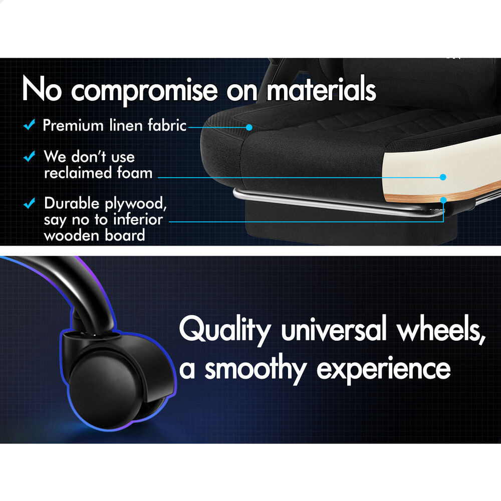 With 12 colours of LED and multiple light settings, this ergonomic gaming chair comes with hundreds of lighting modes, providing a unique and aesthetic glow to your gaming setup. Upholstery crafted from premium linen fabric and generous foam paddings ensures optimal durability and easy cleaning.