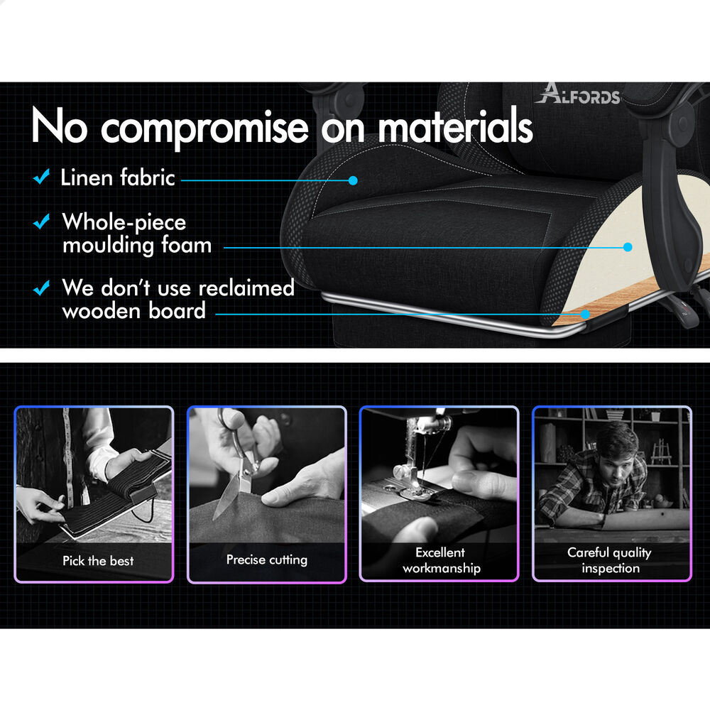 Advanced RGB LED lighting design – With 12 colours of LED and multiple light settings, this ergonomic gaming chair comes with hundreds of lighting modes, providing a unique and aesthetic glow to your gaming setup. Upholstery crafted from premium linen fabric and generous foam paddings ensures optimal durability and easy cleaning.