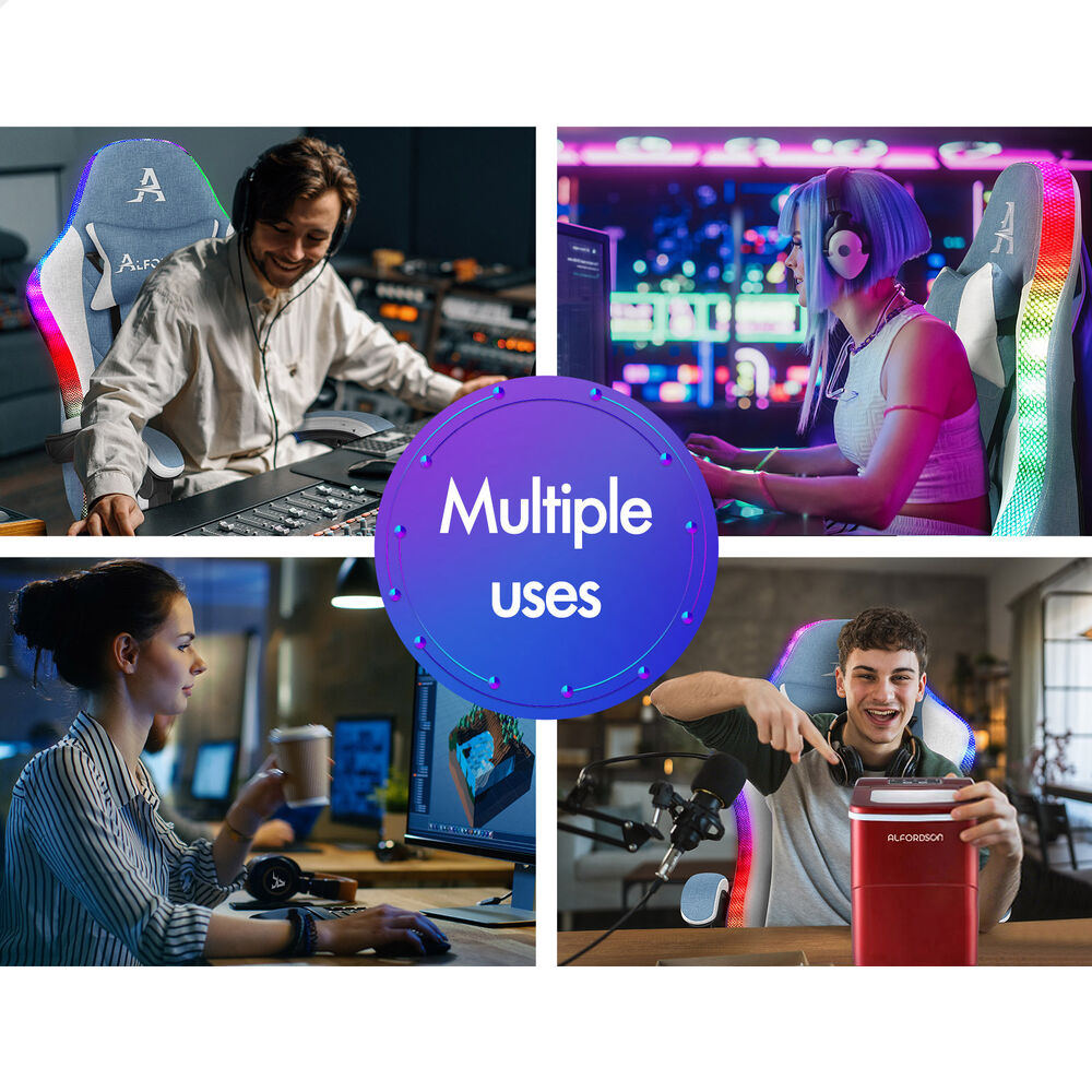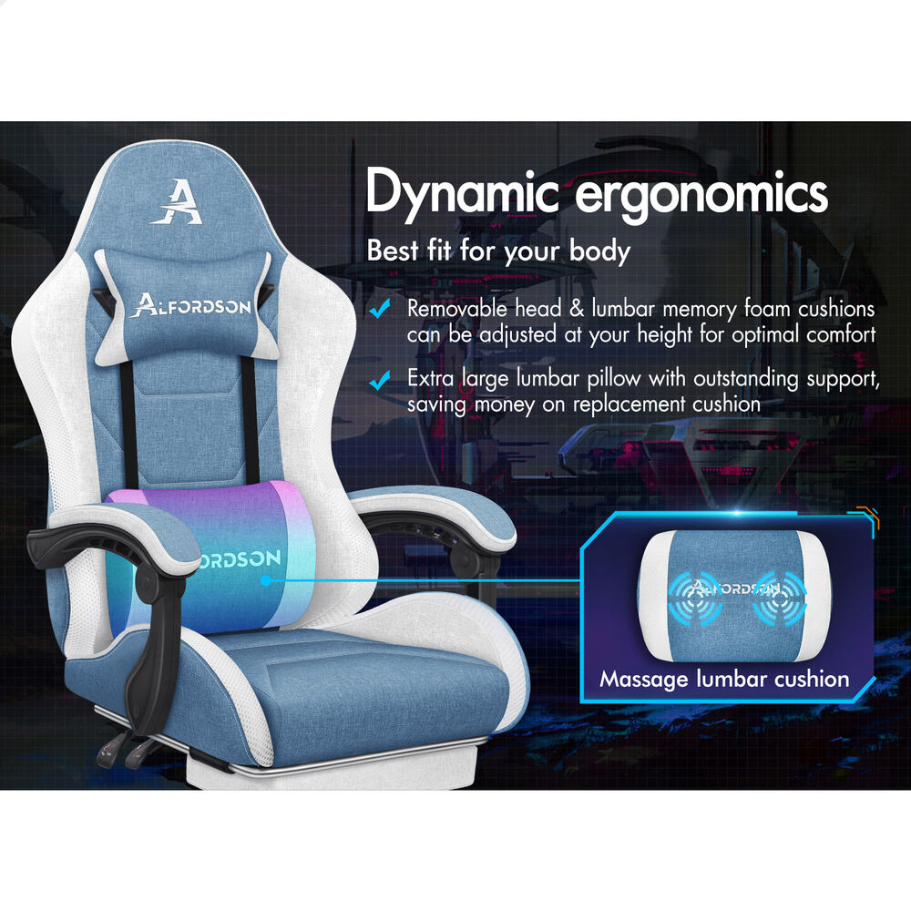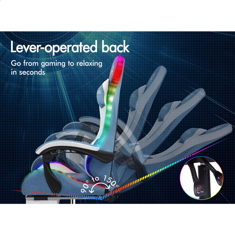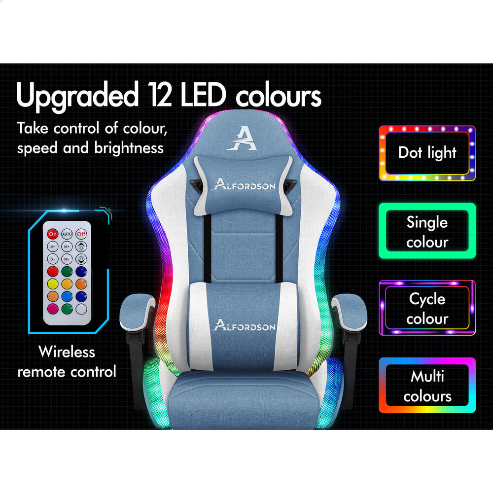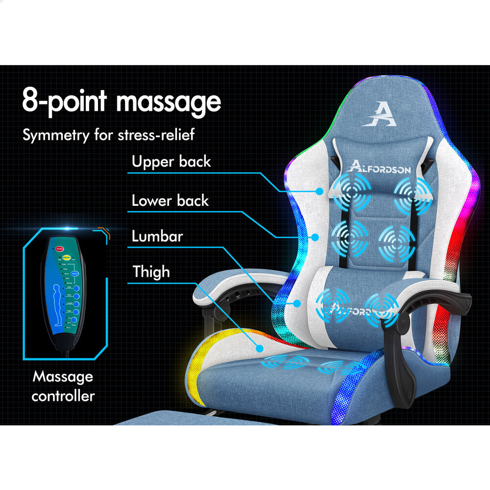 ALFORDSON Gaming Chair Office Massage 12 RGB LED Computer Seat Fabric White Blue