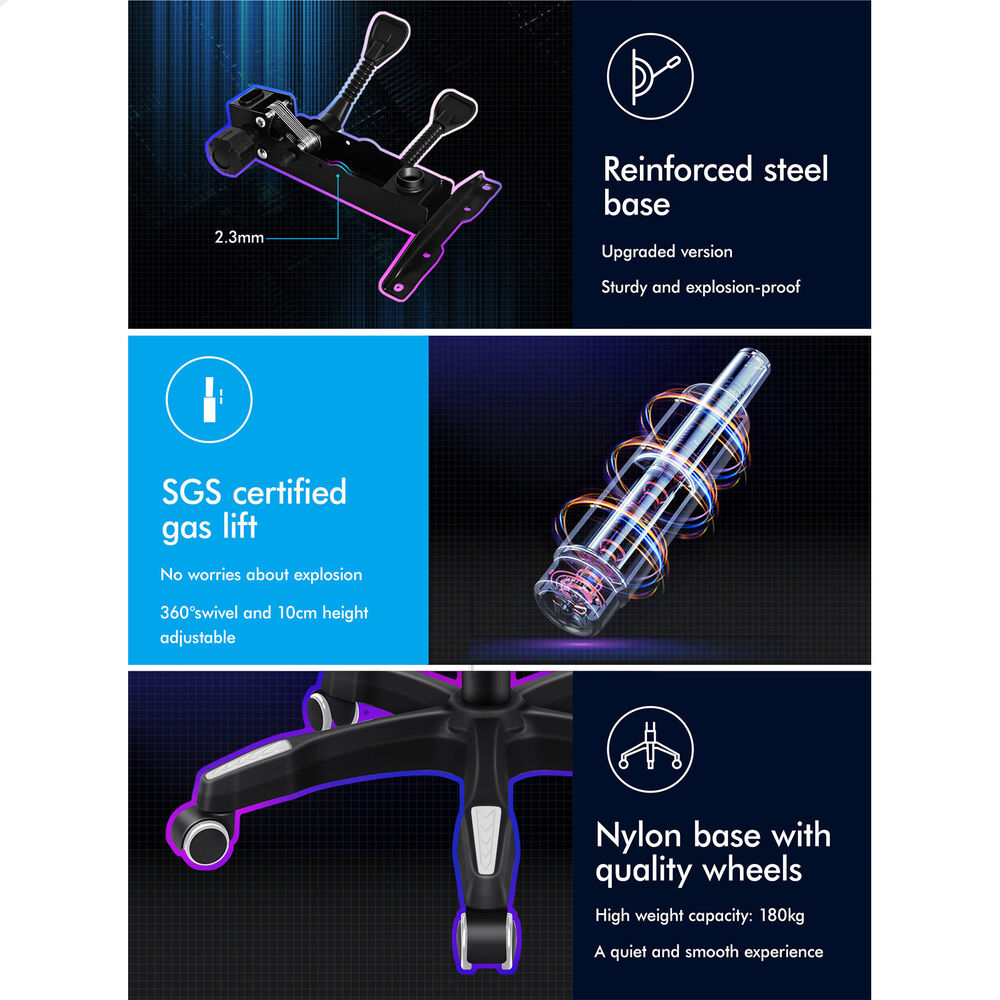 Glide smooth on a reinforced base - Constructed with a sturdy nylon base, TUV certified casters and SGS approved Gas-lift system, the chair is endurable. You don’t have to worry about tipping over or exploding. The 360 degree swivel and height adjustable seat adds more convenience. The heavy duty base merges robust support with color - accented style, syncing seamlessly with your gaming setup.