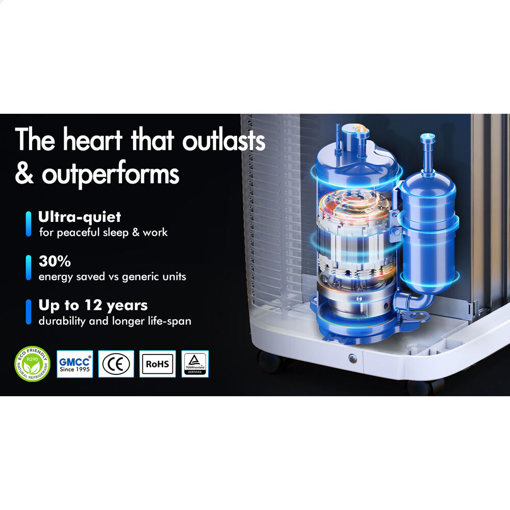 Powerful cooling technology - Equipped with an upgraded GMCC® compressor from a 30-year global leader in professional cooling tech, this ALFORDSON® portable air conditioner has a 12000 BTU cooling capacity. It provides instant relief from the sweltering heat in large areas up to 30 SQM, ensuring you stay comfortable no matter where you are in the house.