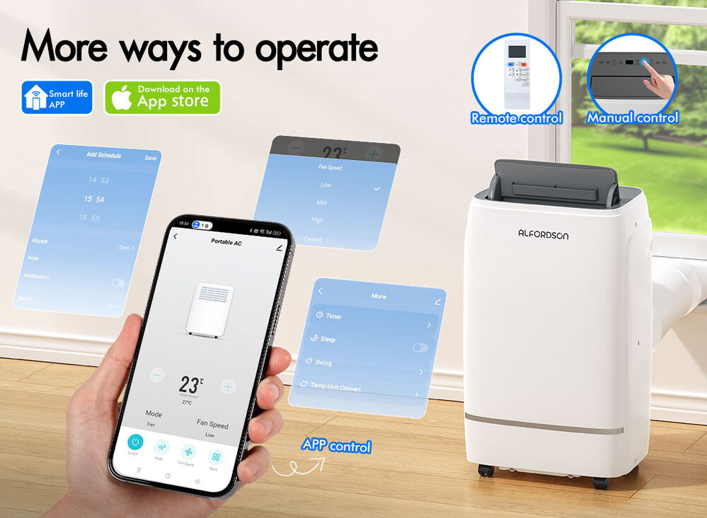 Multiple Controls—Stay in complete command of your comfort with three convenient ways to control your portable air conditioner: easily adjust settings on the intuitive LCD, charge across the room with the handy remote, or manage your climate anytime, anywhere via smartphone app. Your perfect temperature is always at your fingertips.
