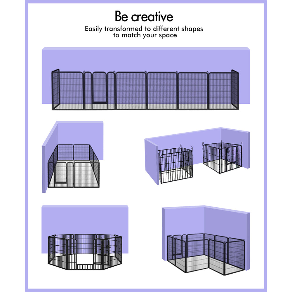 It comes with multiple configuration, which gives you a whole new range of placement options. For example, you can position the playpen in a corner or just against a wall. With the pole-connected design, the activity area of your pet can be enlarged. Think about going camping with your pet, more panels can be connected together to create a sufficient space for moving around safely.