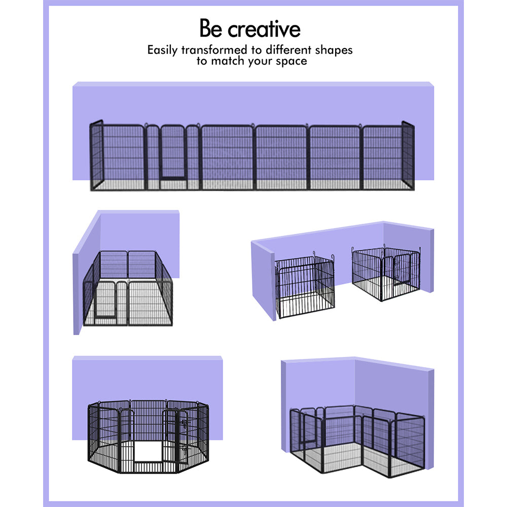 It comes with multiple configuration, which gives you a whole new range of placement options. For example, you can position the playpen in a corner or just against a wall. With the pole-connected design, the activity area of your pet can be enlarged. Think about going camping with your pet, more panels can be connected together to create a sufficient space for moving around safely.
