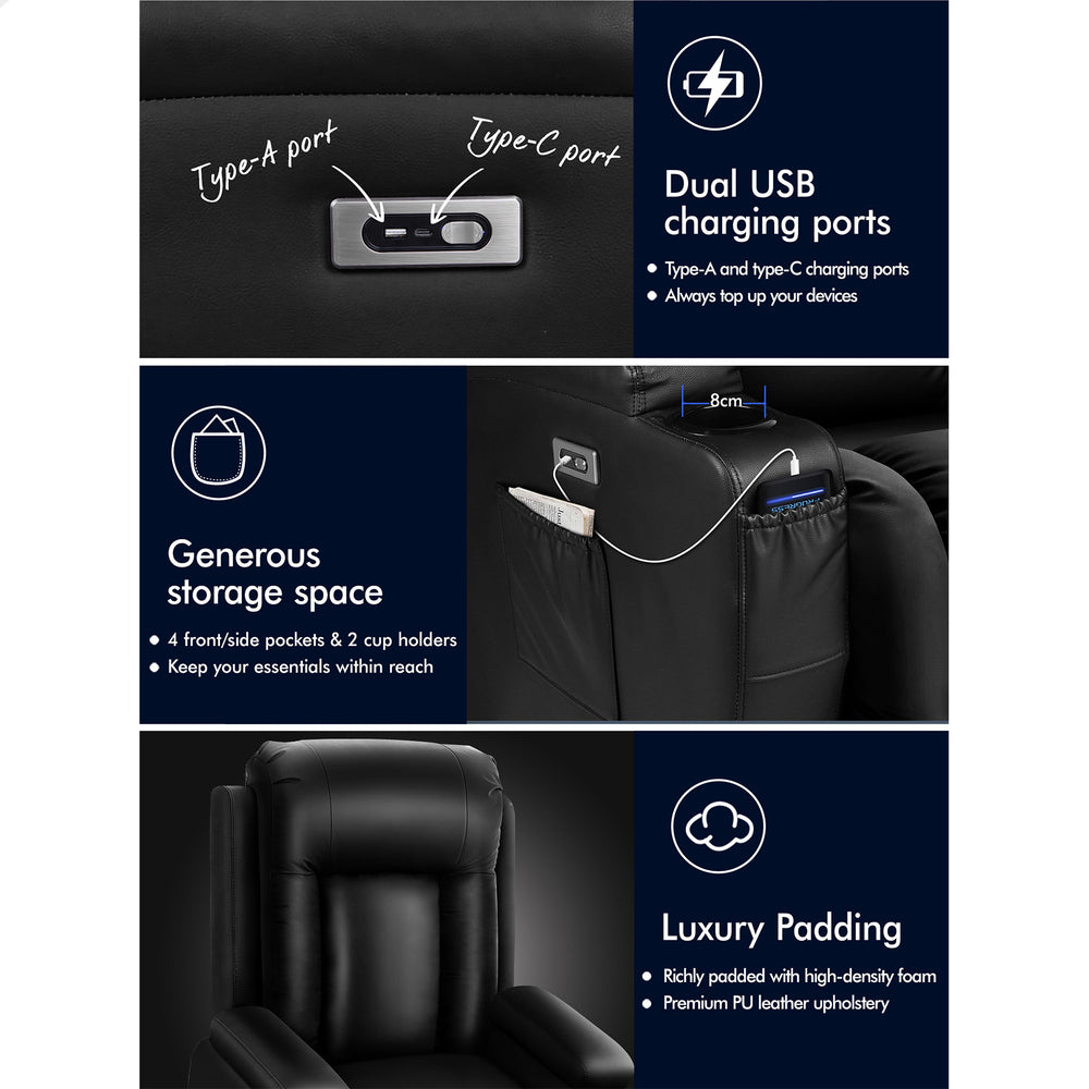 Beyond its therapeutic benefits, this ALFORDSON® recliner chair features many user-friendly details. We've thought of everything to make your relaxation experience seamless and enjoyable. Dual convenient charging ports ensure your devices are always powered up. You can also keep your essentials organized with 2 cup holders and 4 spacious side pockets so that everything you need will be within reach during your unwinding moments. Its ergonomic design conforms to the natural body curves for optimal weight distribution and pressure relief.