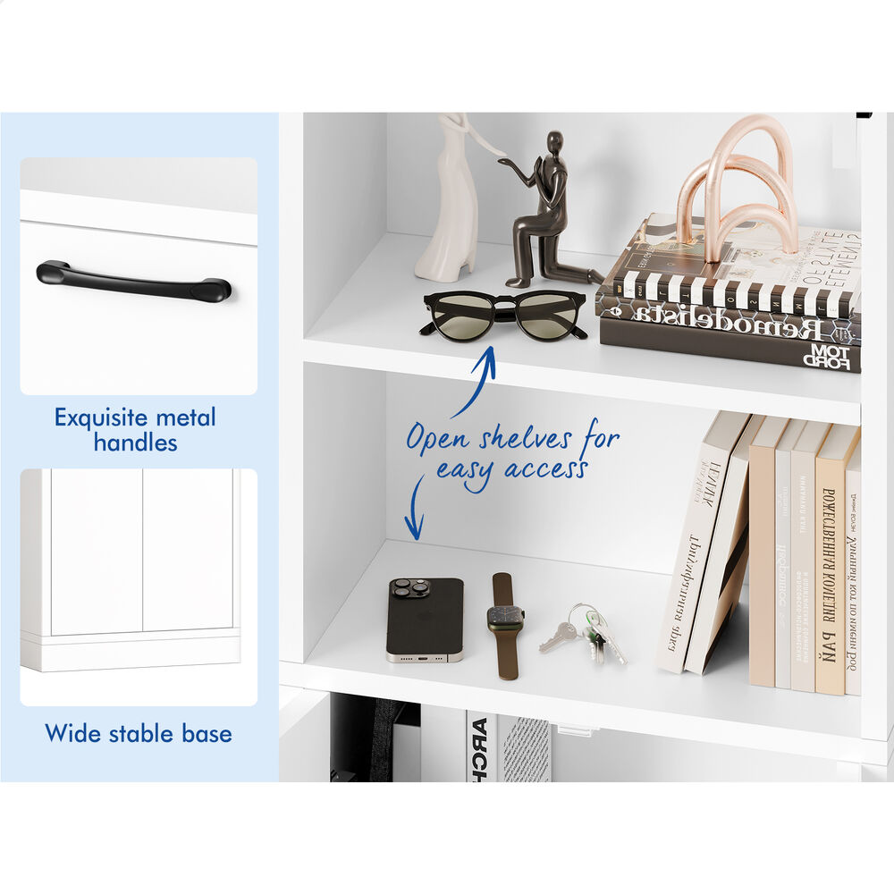 * Two open shelves for display and handy storage