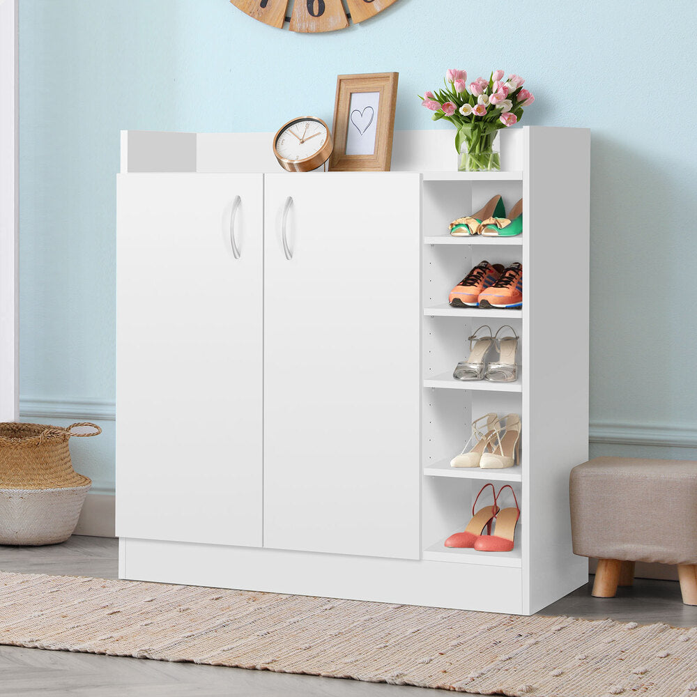 The shoe cabinet features 4 shelving compartments behind 2 doors to store up to 16 pairs of shoes, while open shelves to the side fits up to 5 pairs for quick access of your everyday shoes with ease. All tiers are adjustable for versatile storage needs.