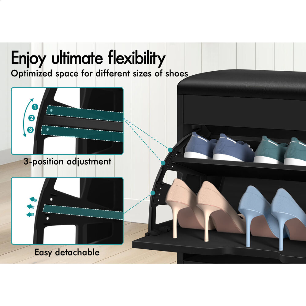 Not only will it add a touch of elegance to your home, but the shoe cabinet bench also effortlessly declutters your space. By storing up to 18 shoes, it feaures three-tier shelves and three open shelves which are adjustable according to the size of your shoes: flat shoes, high heels, boots or slippers. Thanks to its flip-drawer design, it can easily transform into a bench, giving you a comfy space to sit and pop your shoes on in a jiffy. Under the seat, you will find an additional storage space to keep your keys, watch, umbrella, sunglasses or other items for quick assess.