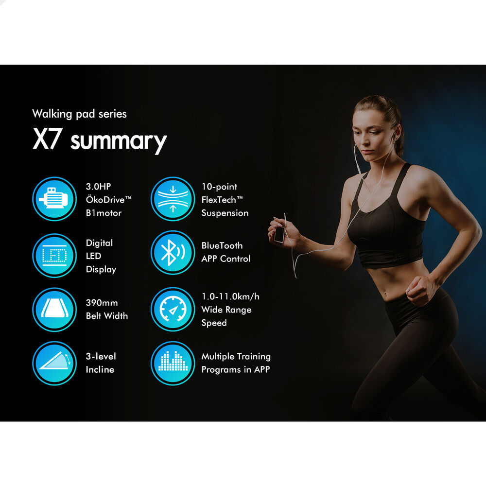 This Walking Pad X7 is the ideal piece of in-home exercise equipment to get you moving and burning calories on a daily basis. With the unique built in Bluetooth technology, it allows wireless access to the FitShow® App on your phone to sync and track your workout stats. Similarly, equipped with a large LED display, you can stay in clear and precise control. It allows you to use metrics like speed, mileage, calories burned, and more to achieve goals and push your limit. Additionally, this treadmill features a powerful and energy-efficient 3.0HP ÖkoDriveTM B1 motor with digital quick speed control of 1-11KM/H. Either remote control or APP control can let you to enjoy the journey at your desired speed.