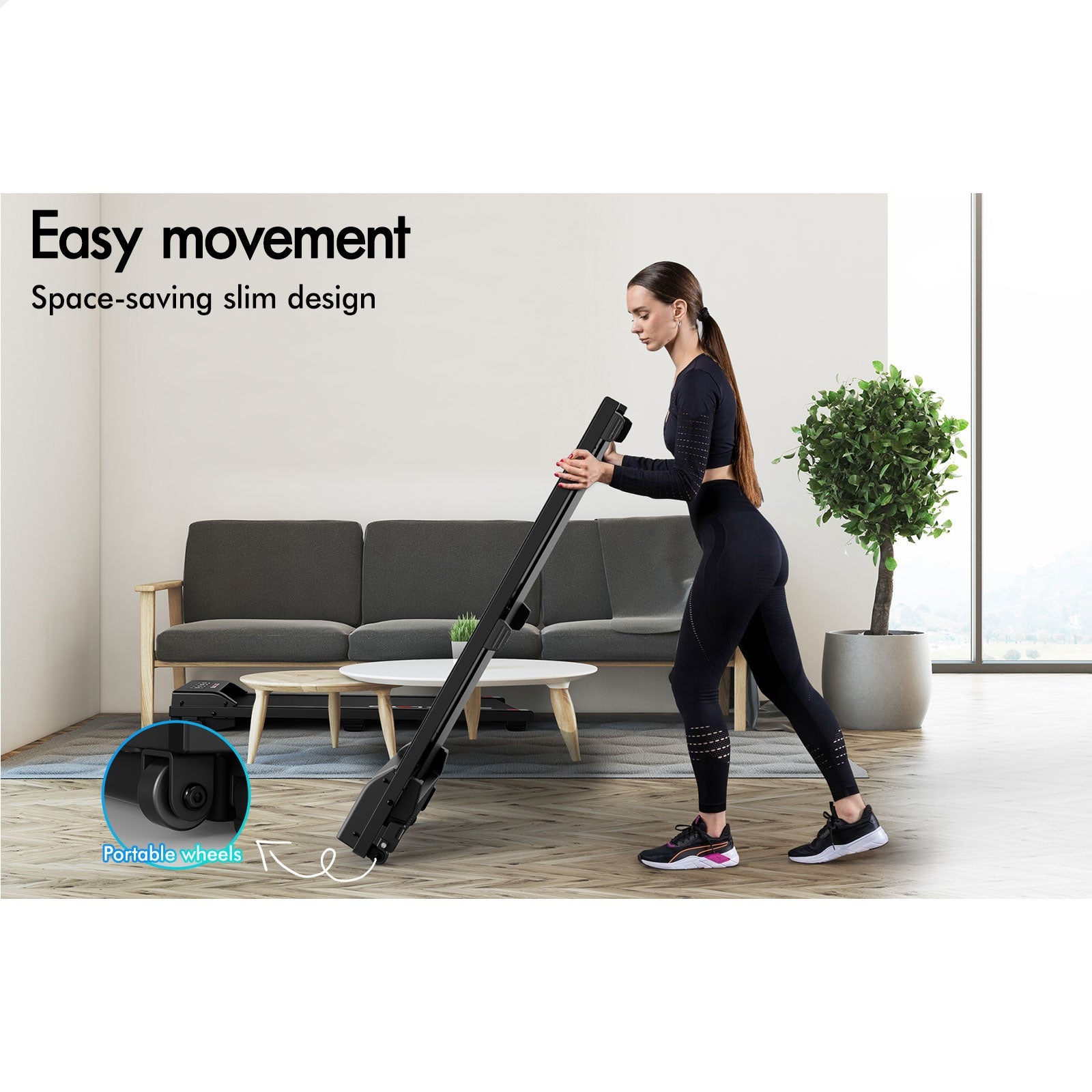 The unique portable wheel design makes it a breeze to move around and store it under the sofa or bed. Compact yet powerful, this under desk treadmill fits seamlessly into your lifestyle. Whether you're working at a standing desk, watching TV, or squeezing in a quick exercise session, this walking pad helps you stay active without interrupting your day.
