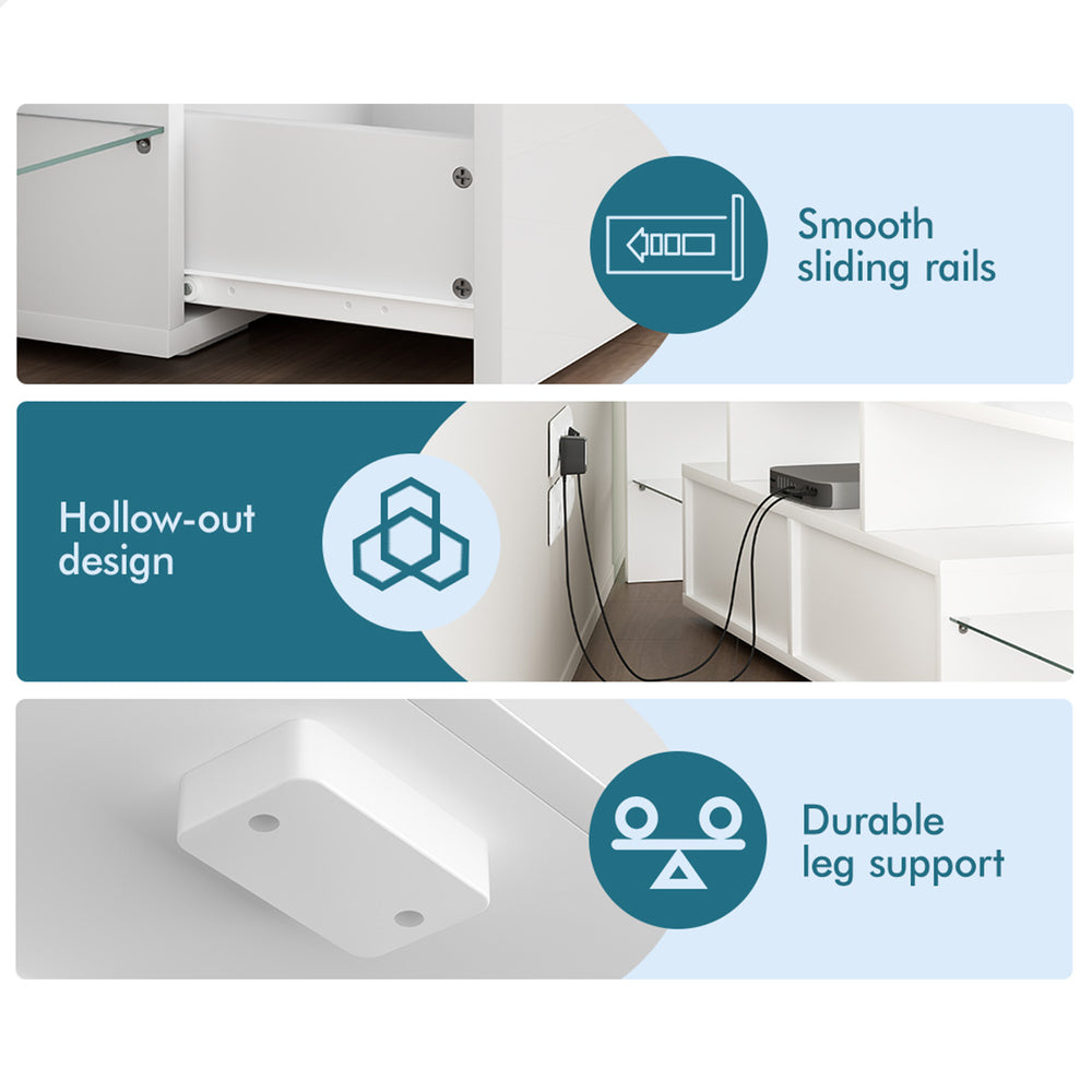 Structural stability - Made of superior E1 grade and 15mm thick particle board, our entertainment unit is durable and resistant to scratches. Instead of flimsy paper finish, it is well made with melamine and UV high gloss finish which is easy to maintain and long lasting. Equipped with push-to-open system, the drawers quietly open and close so you can access your items with ease.