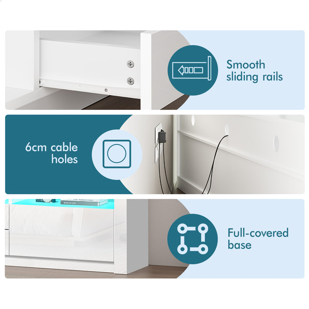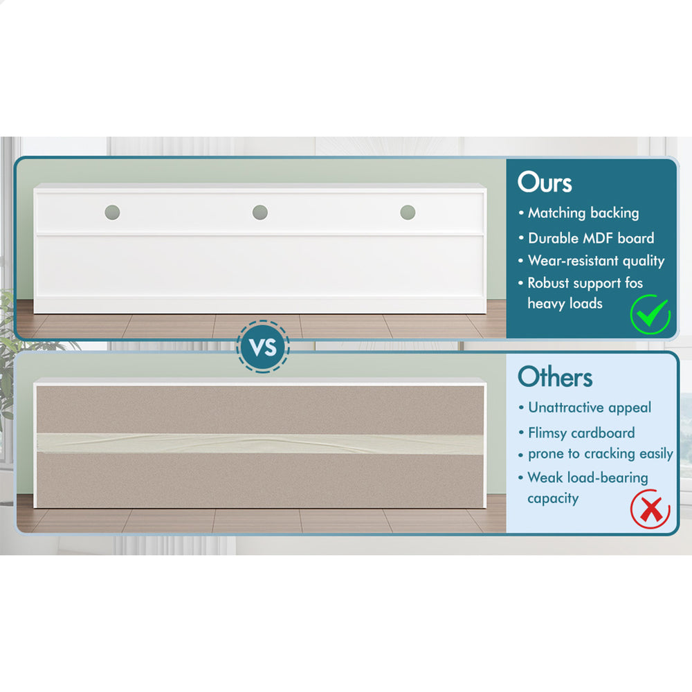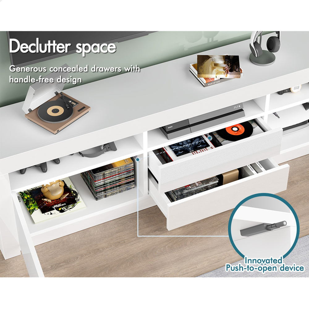 Reliable quality - Made of superior E1 grade and 15mm thick particle board, our entertainment unit is durable and resistant to scratches. Instead of flimsy paper finish, it is well made with melamine and UV high gloss finish which is easy to maintain and long lasting. Equipped with push-to-open system, the drawers quietly open and close so you can access your items with ease.