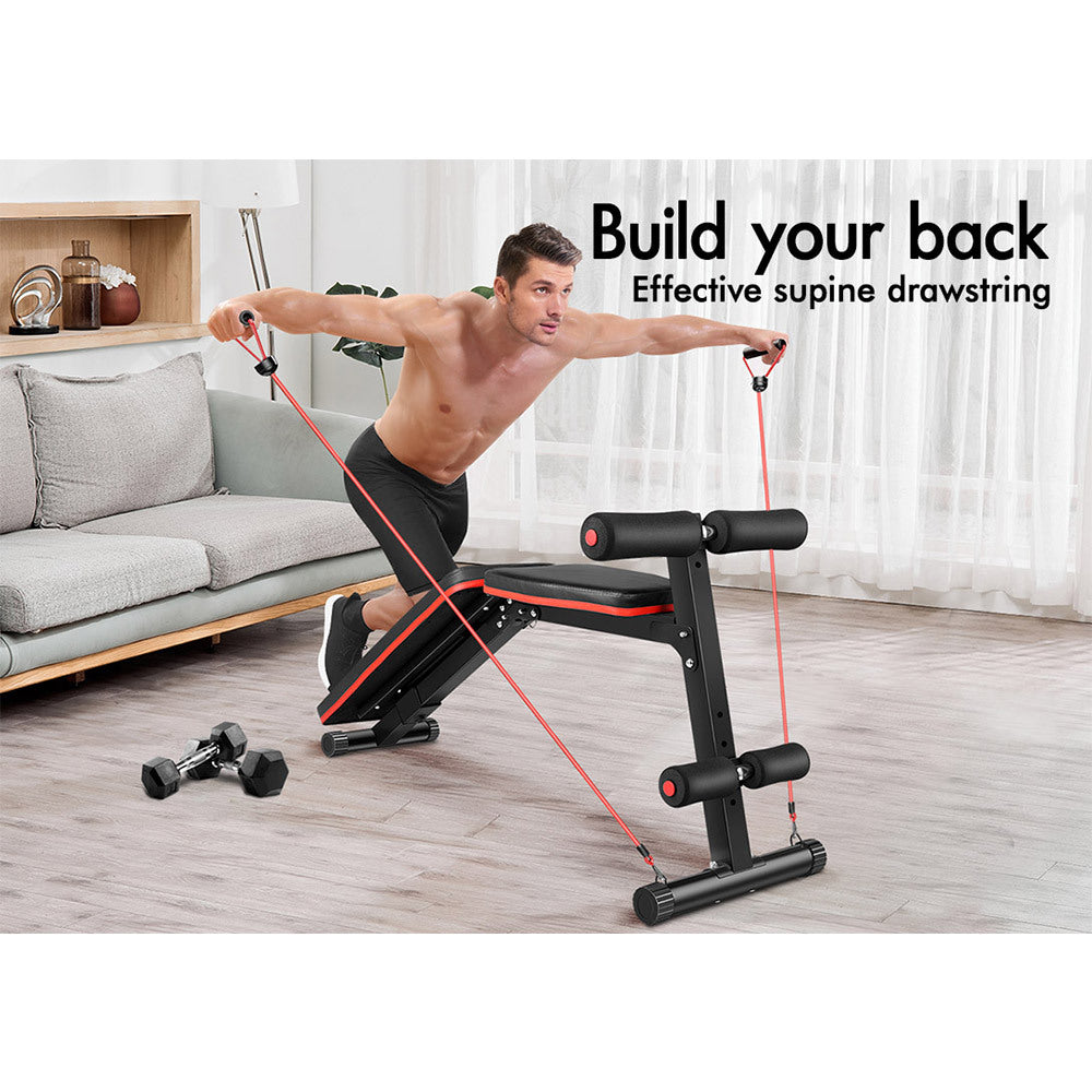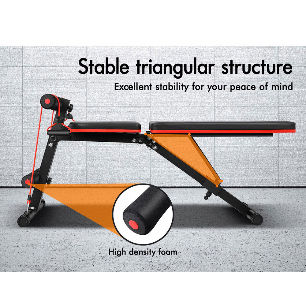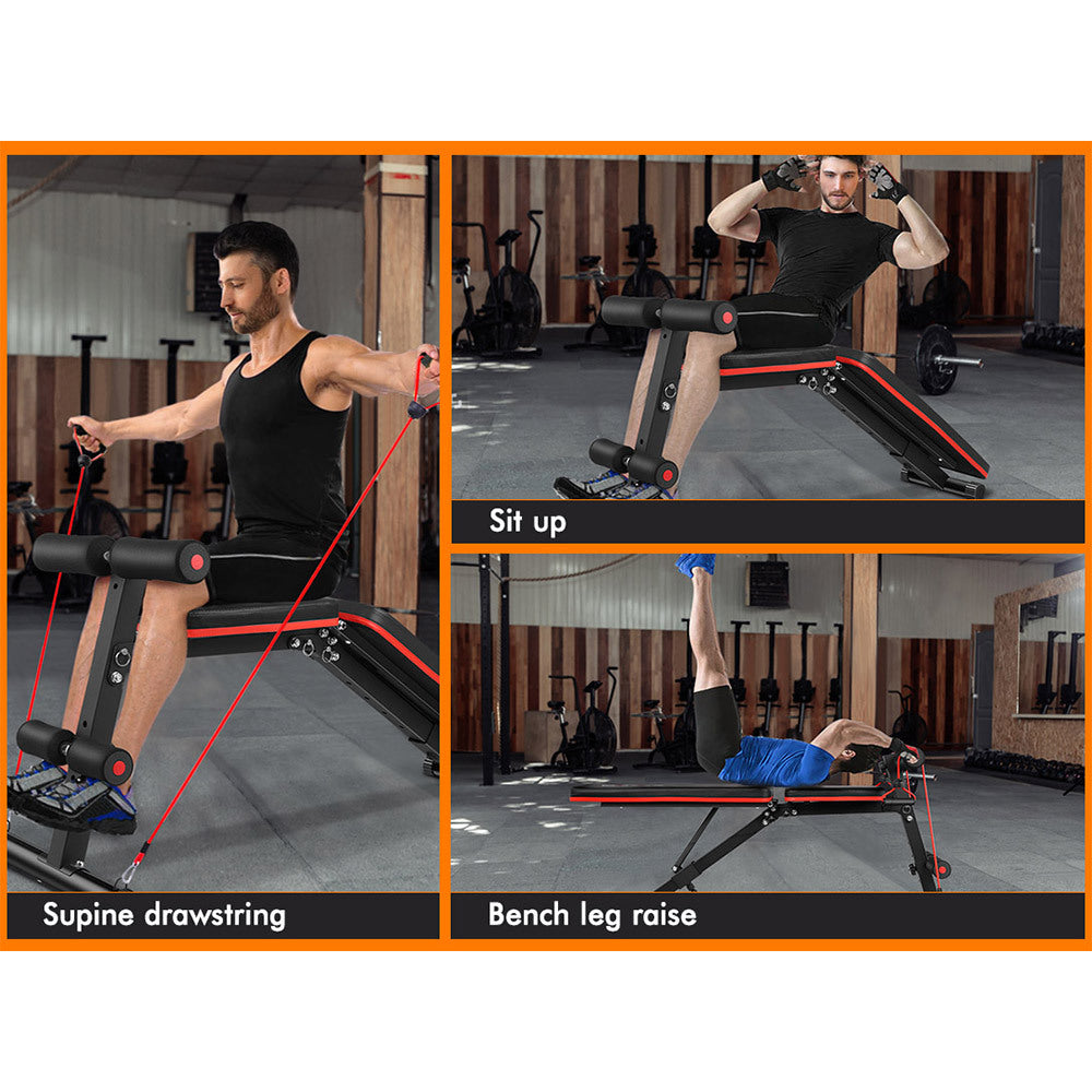 Constructed from quality steel, extra-thick foam, and breathable but sweat-proof faux leather, the bench is designed to be durable with 200kg weight capacity and offers rock-solid stability. The gorgeous powder-coated paint job will keep it looking fresh for years to come. Equipped with bonus resistance bands at front, you can build your back muscle at ease. Best of all, the ultra-comfortable backrest can conveniently be adjusted to incline, flat and decline positions for a variety of exercises. Crafted with safety in mind, the bench is also equipped with sturdy rubber feet to keep the metal frame from damaging flooring and to keep the bench in place.
