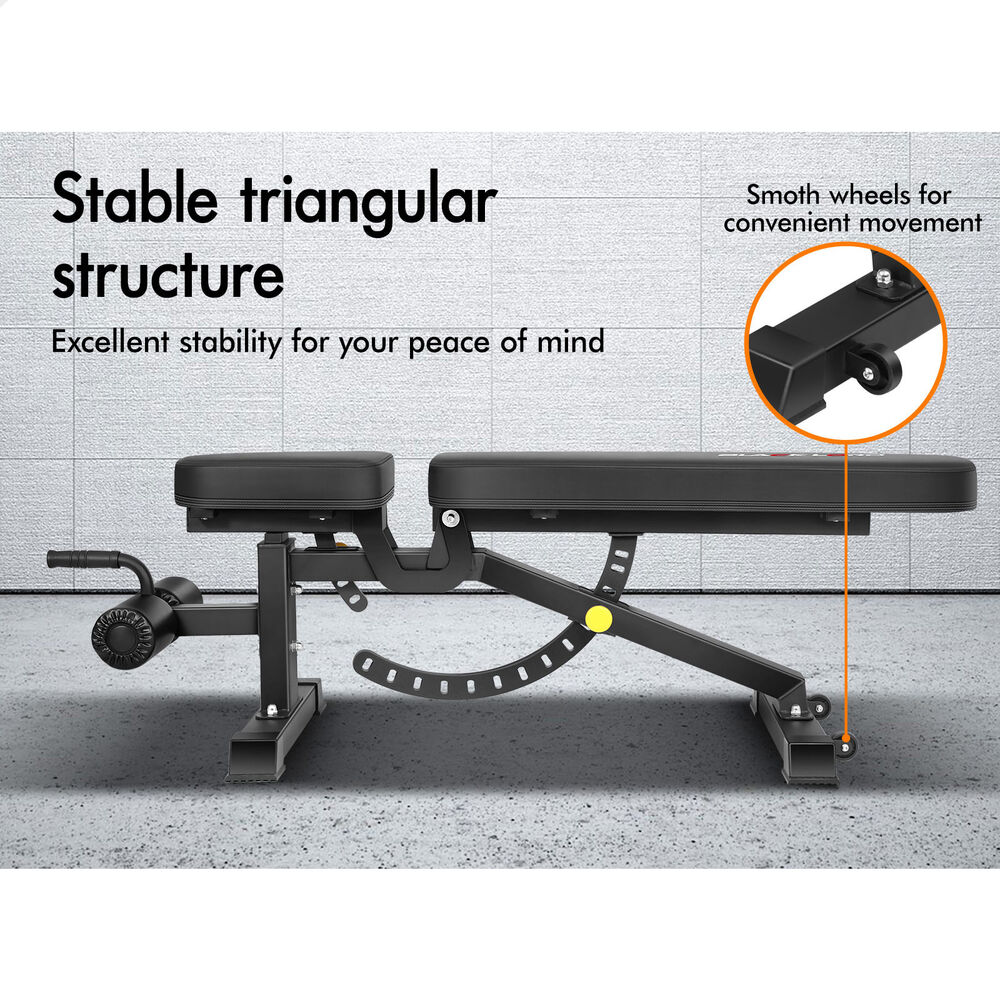 Constructed from heavy-duty steel, extra-thick foam, and breathable but sweat-proof faux leather, the bench is designed to be durable with 450kg weight capacity and offers rock-solid stability. The gorgeous powder-coated paint job will keep it looking fresh for years to come. Best of all, the ultra-comfortable backrest can conveniently be adjusted to incline, flat and decline positions for a variety of exercises. Crafted with safety in mind, the bench is also equipped with sturdy rubber feet to keep the metal frame from damaging flooring and to keep the bench in place.