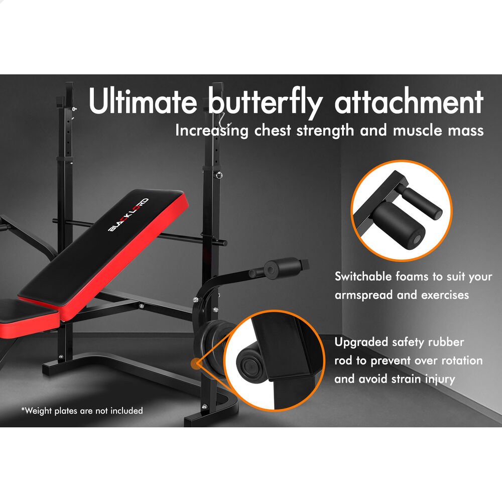 This 8-in-1 weight bench is the ultimate in a wide array of full-body workouts, including military press, bench press, incline press, chest flys, sit ups, leg curls, lying leg curls and arm strength training. One of the special features is the butterfly attachment, which allows you to exercise the outer pectoral muscles that simple bench press can't provide.