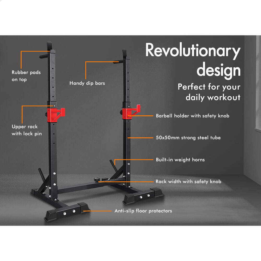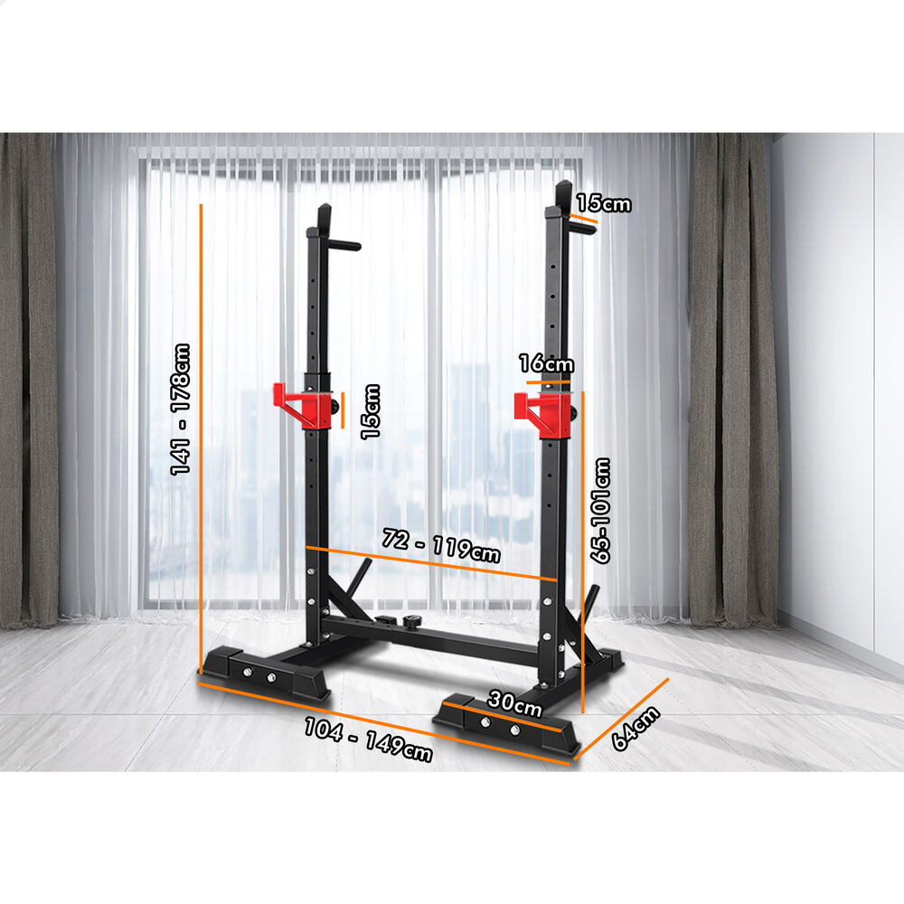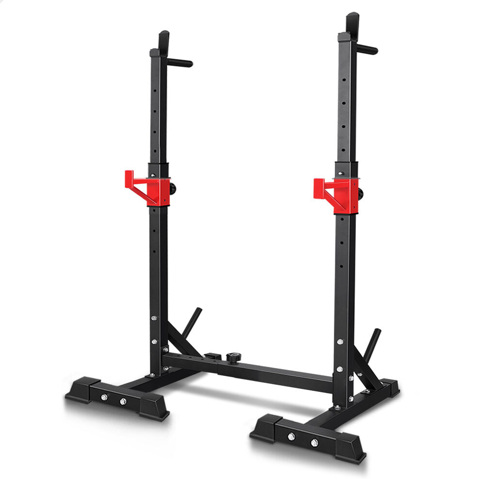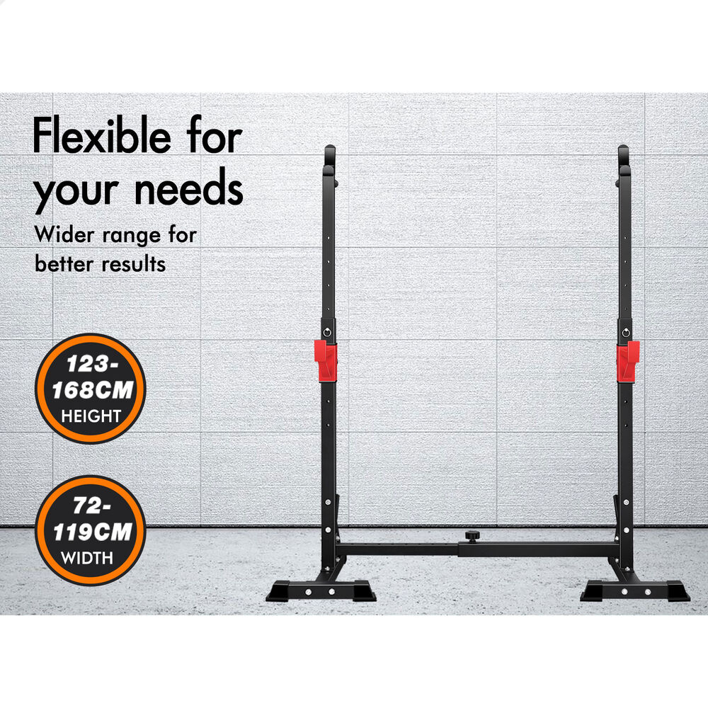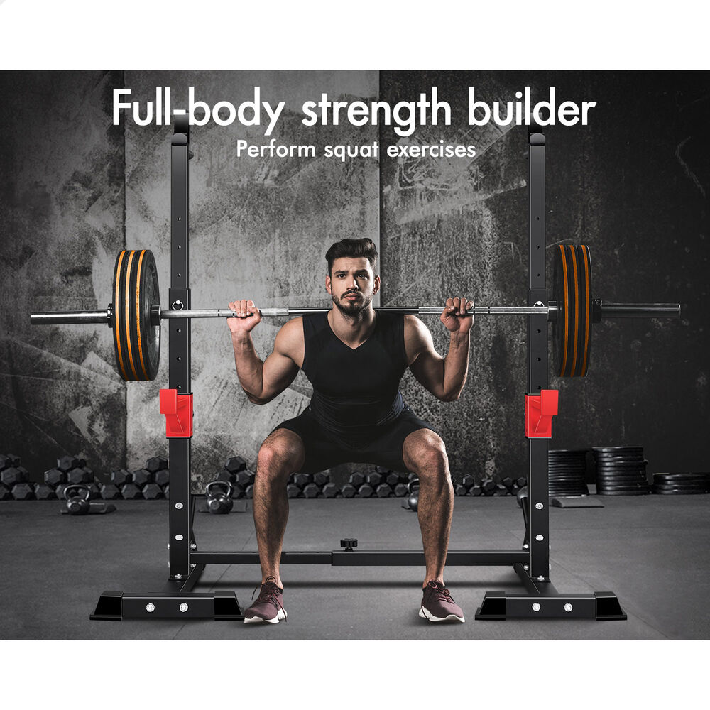The upper rack can be adjusted to 6 height positions and the barbell holder in the middle can also be adjusted to 5 height positions. You could have it as low as it will go into bench presses and then raise it up to a high position for squats. Constructed from quality steel, the squat rack is designed to be durable with 300kg weight capacity and offers rock-solid stability. Crafted with safety in mind, the rack is also equipped with sturdy rubber feet to keep the metal frame from damaging flooring and to keep the rack in place.