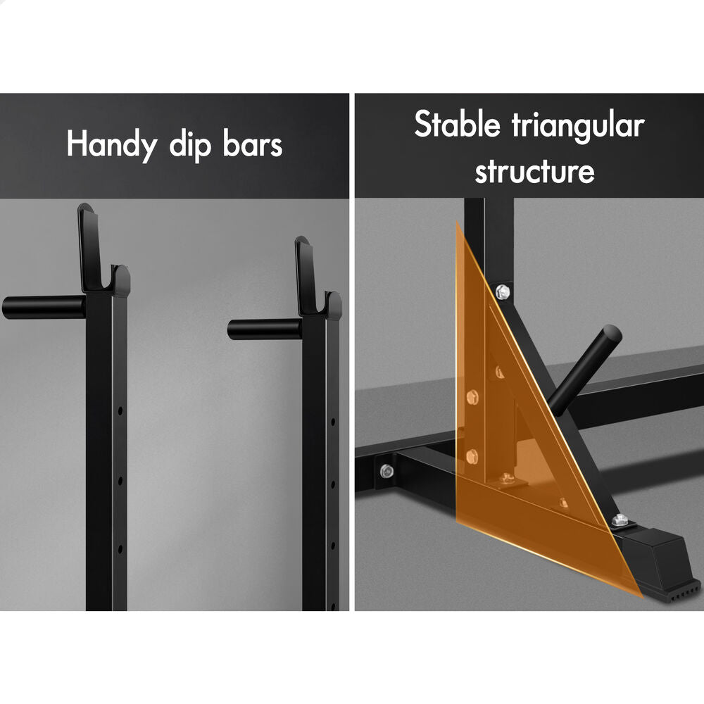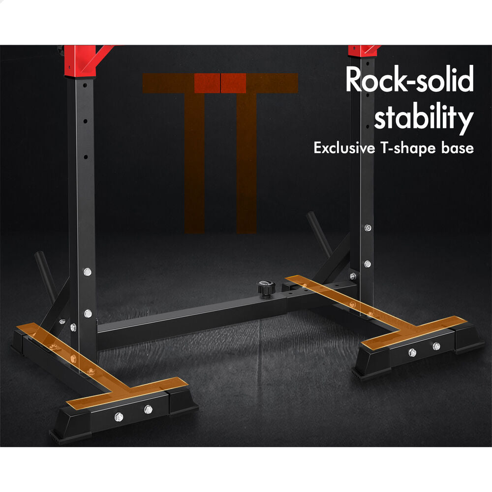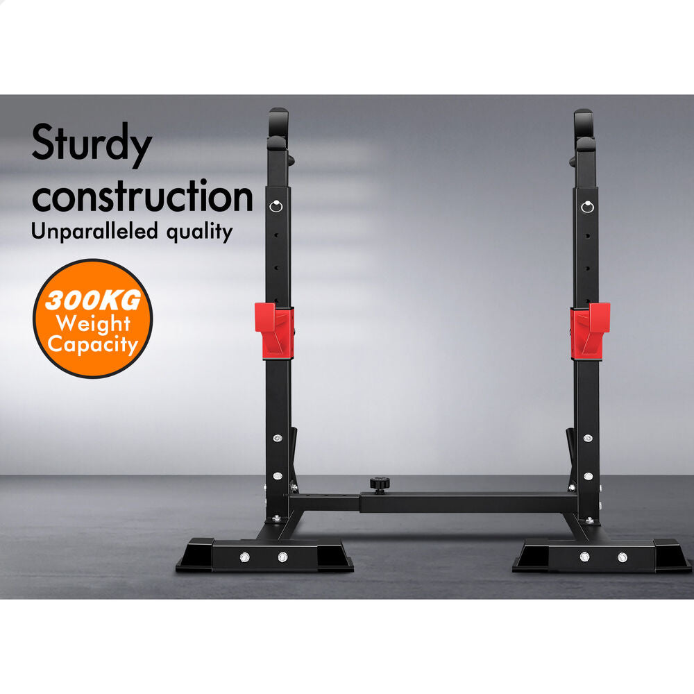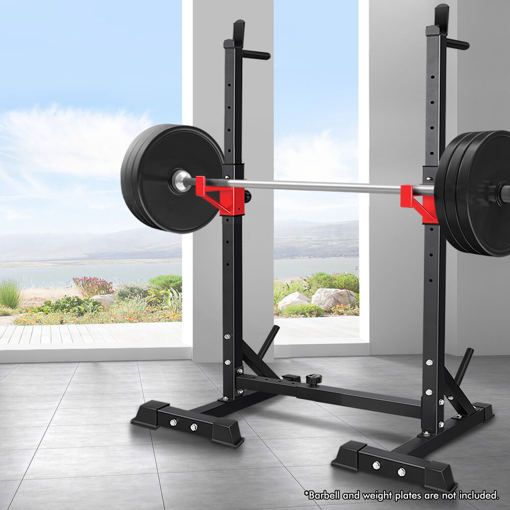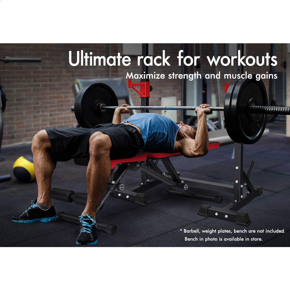 The upper rack can be adjusted to 6 height positions and the barbell holder in the middle can also be adjusted to 5 height positions. You could have it as low as it will go into bench presses and then raise it up to a high position for squats. Constructed from quality steel, the squat rack is designed to be durable with 300kg weight capacity and offers rock-solid stability. Crafted with safety in mind, the rack is also equipped with sturdy rubber feet to keep the metal frame from damaging flooring and to keep the rack in place.