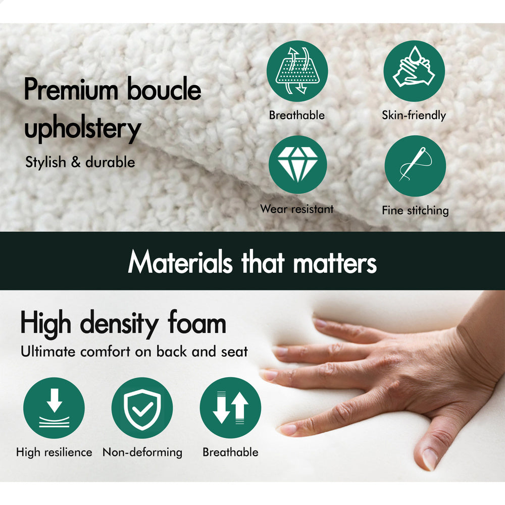 * Seat material: Premium boucle, high density foam, metal frame and wooden board