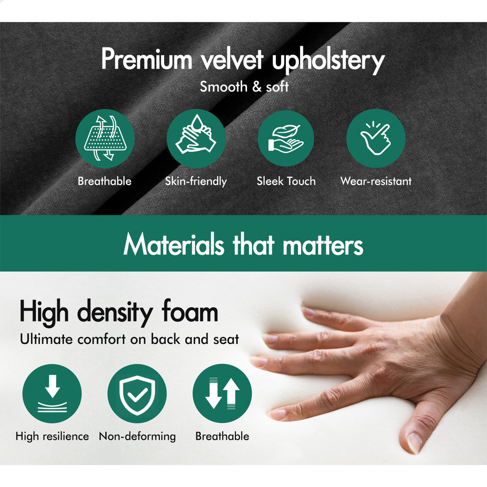 * Seat material: Premium velvet, high density foam, metal frame and wooden board