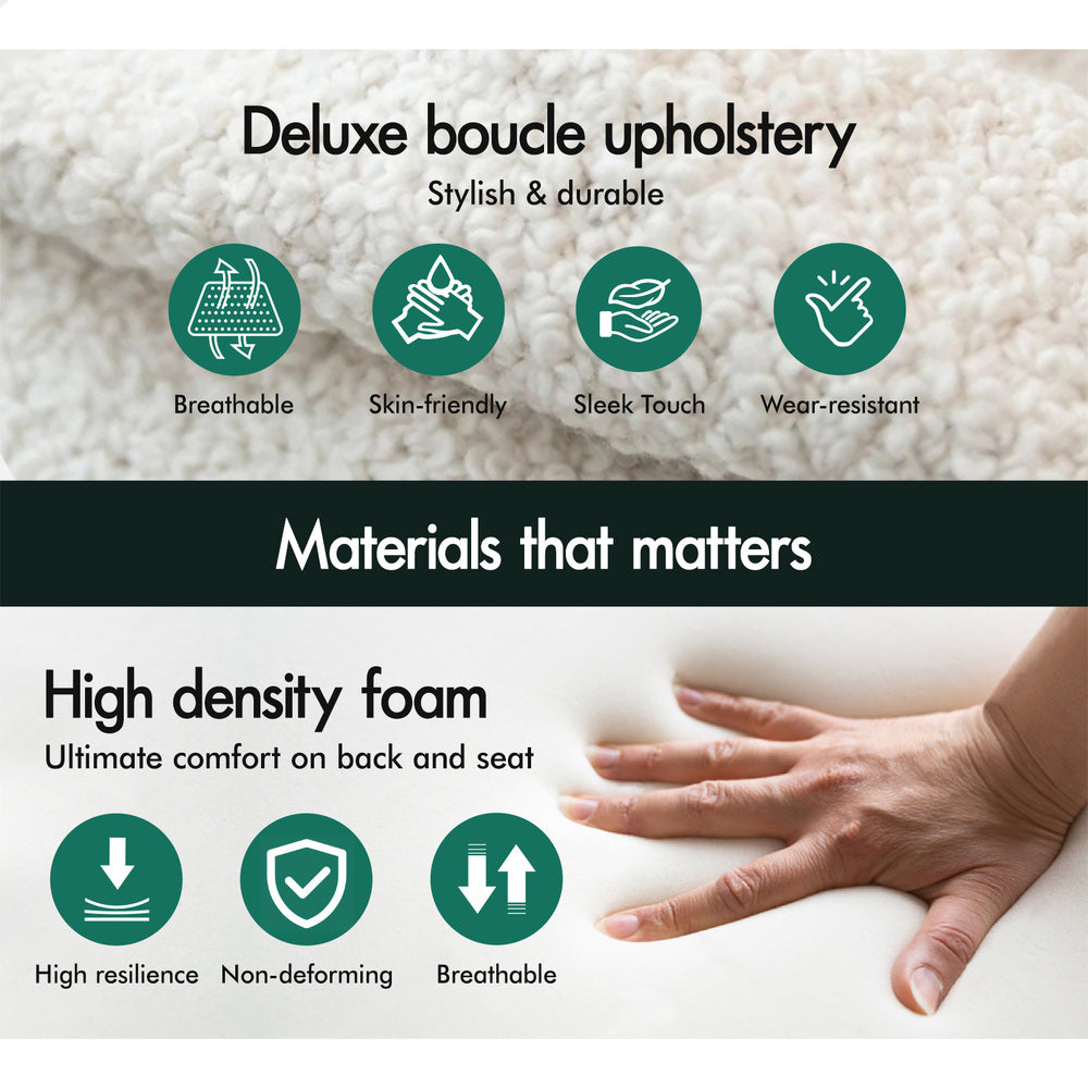 * Seat material: Premium boucle, high density foam, metal frame and wooden board