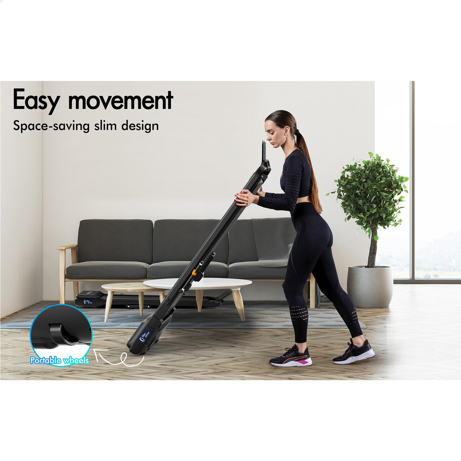 A safety tether key ensures peace of mind by automatically pausing the treadmill if you step away, while the space-saving foldable design with fasten knobs lets you effortlessly collapse the handrails flat for compact storage. The unique portable wheels make it a breeze to move around and store it under the sofa or bed.